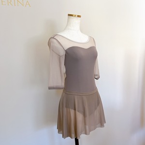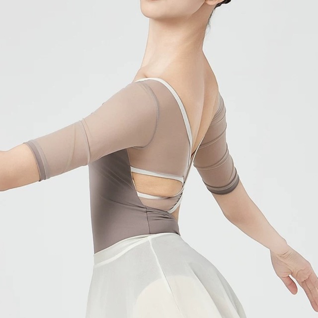 柔らかなグレージュカラーと透け感のあるメッシュスリーブが上品なレオタード。