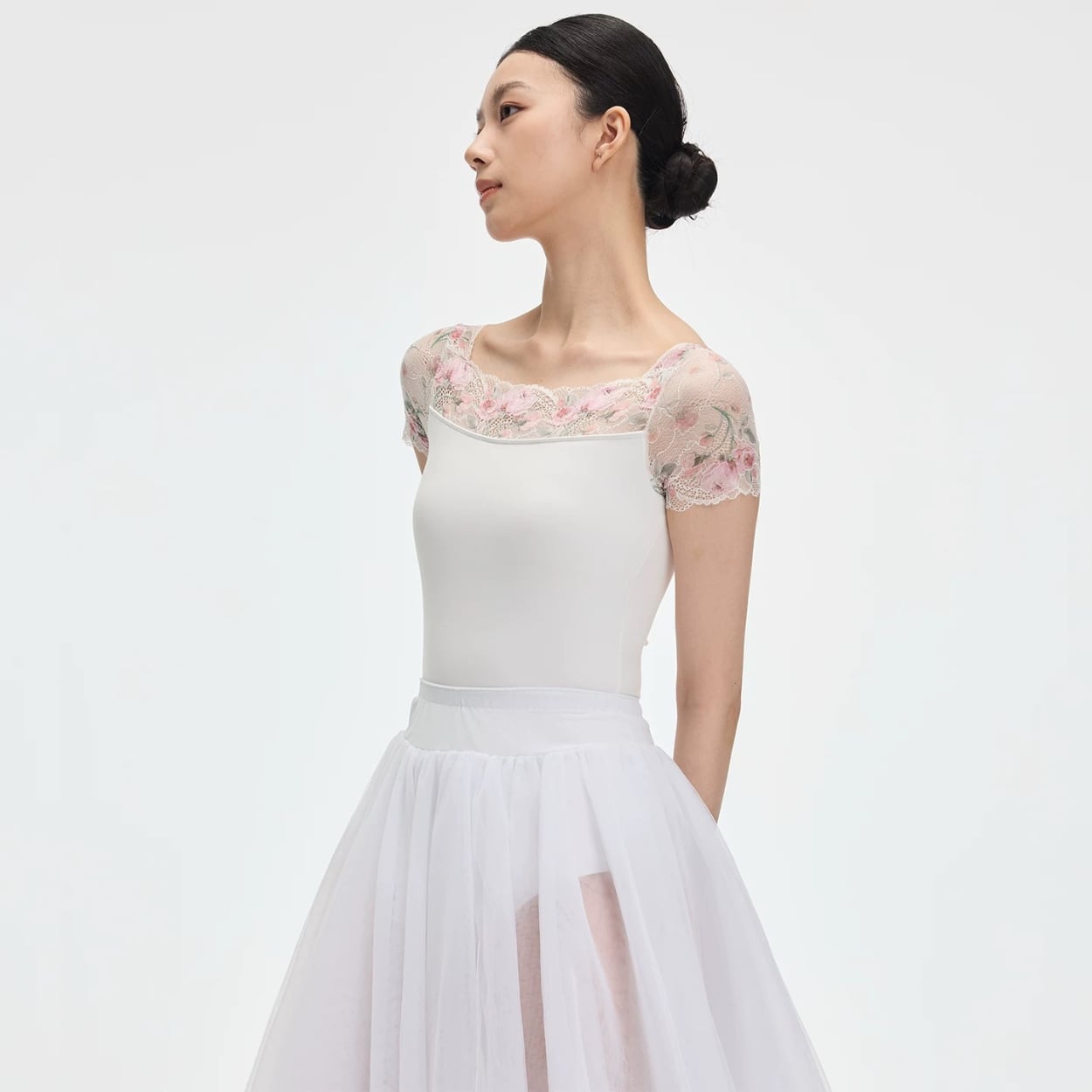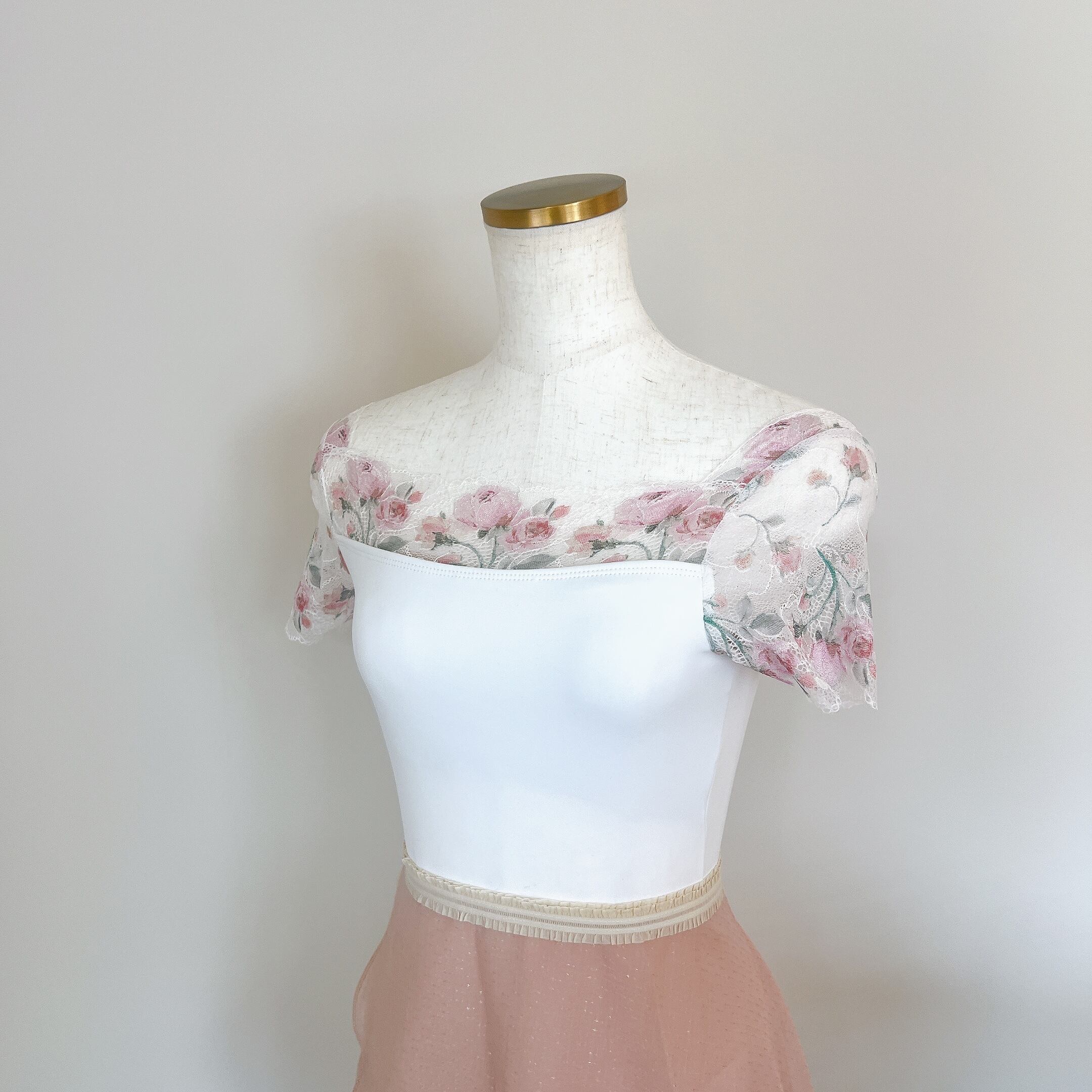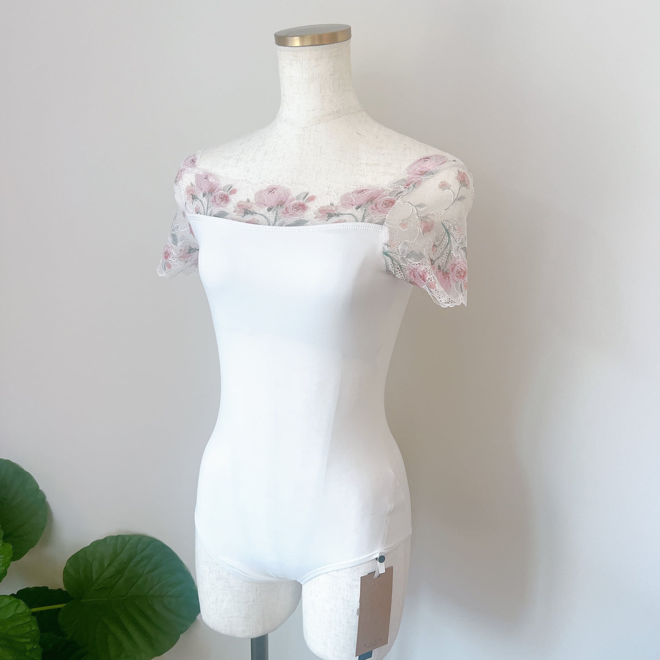 floral ワイドレース オフショルダー バレエレオタード (White)