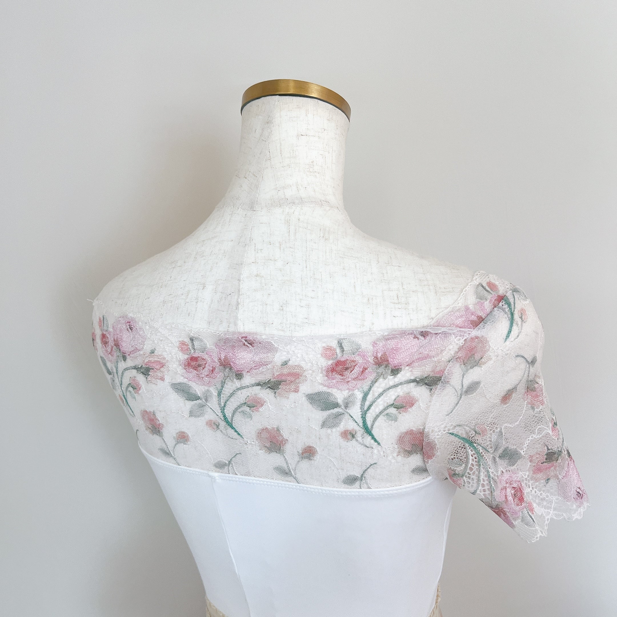 デコルテラインを美しく彩ってくれるフラワー刺繍がお顔周りをパッと華やかに見せてくれます。