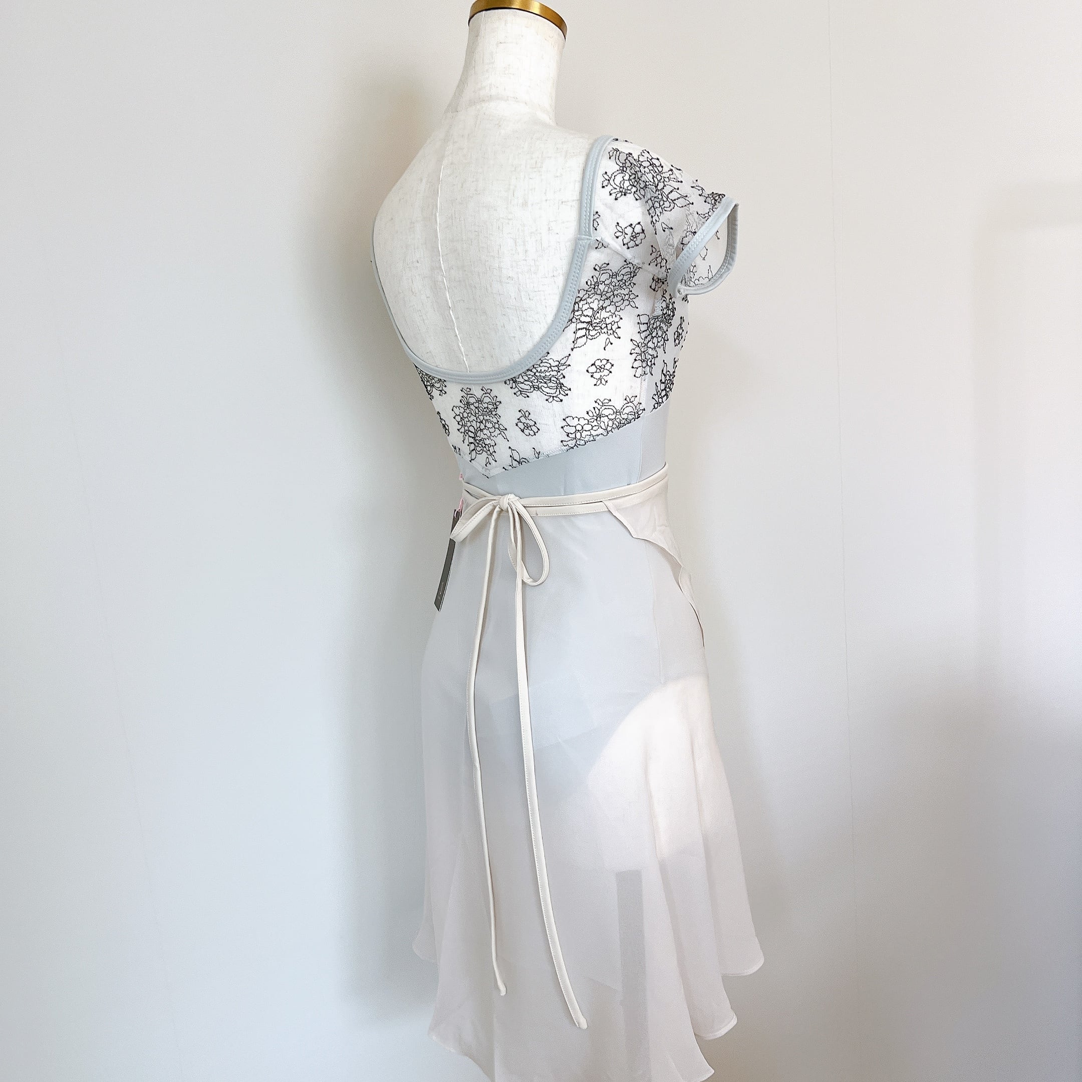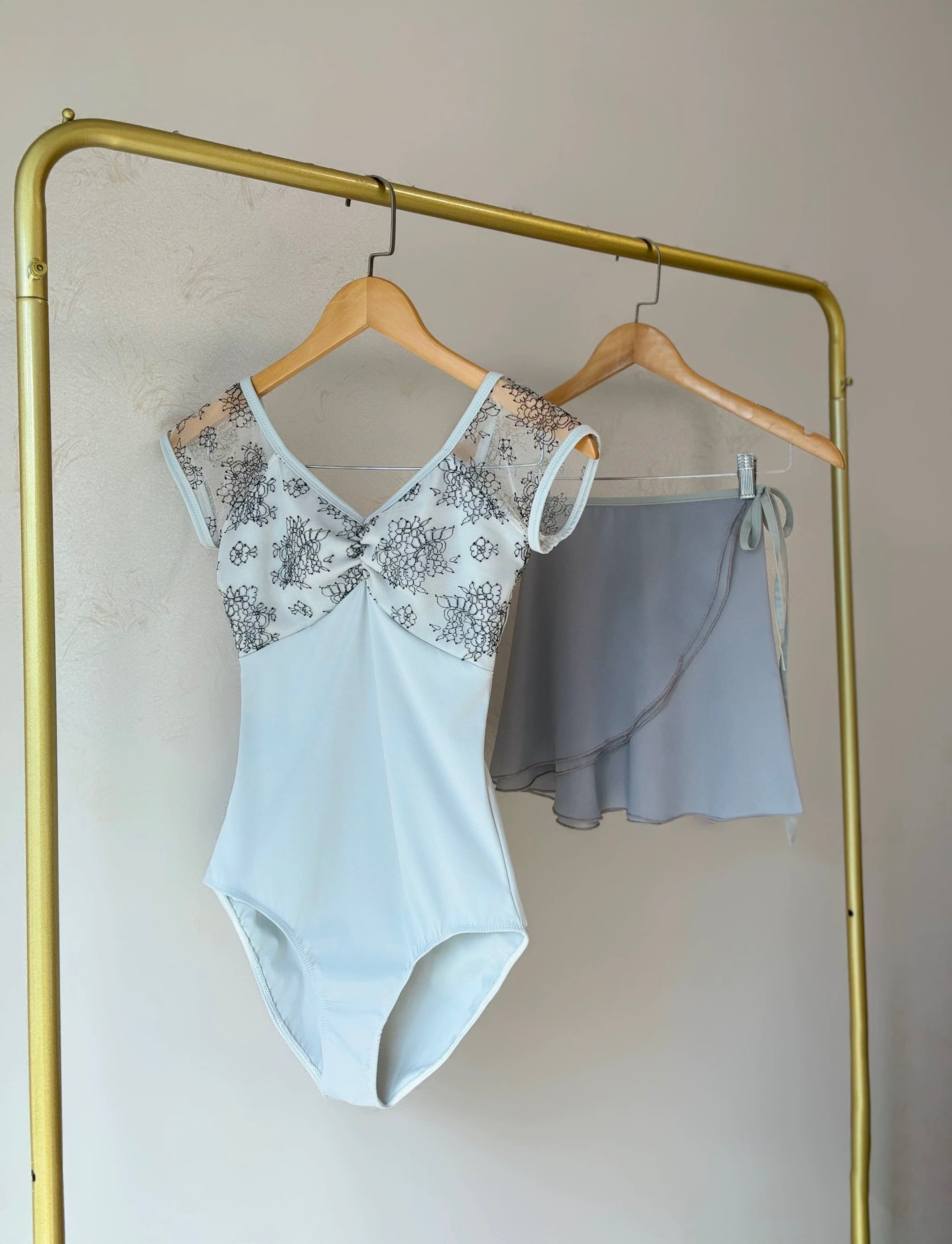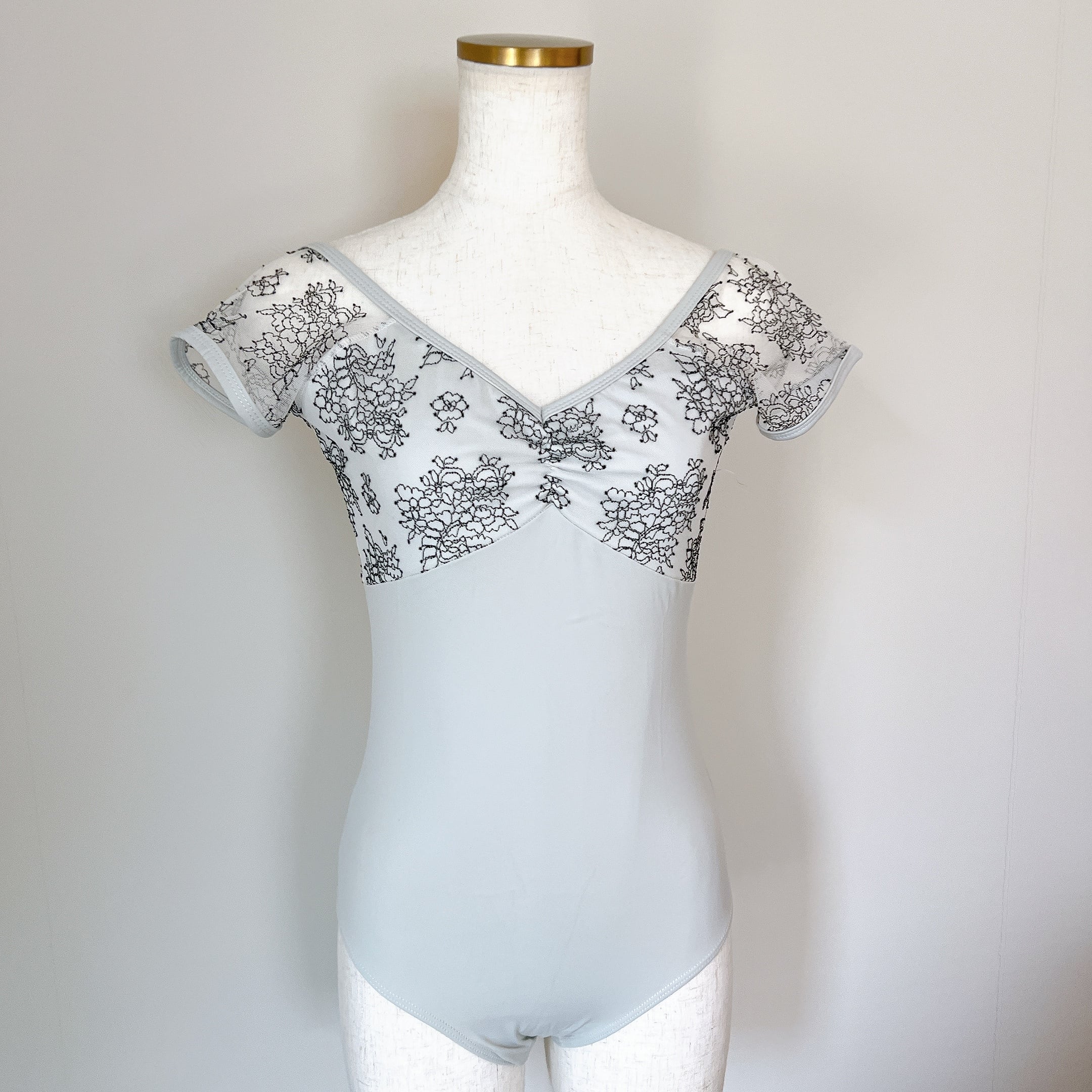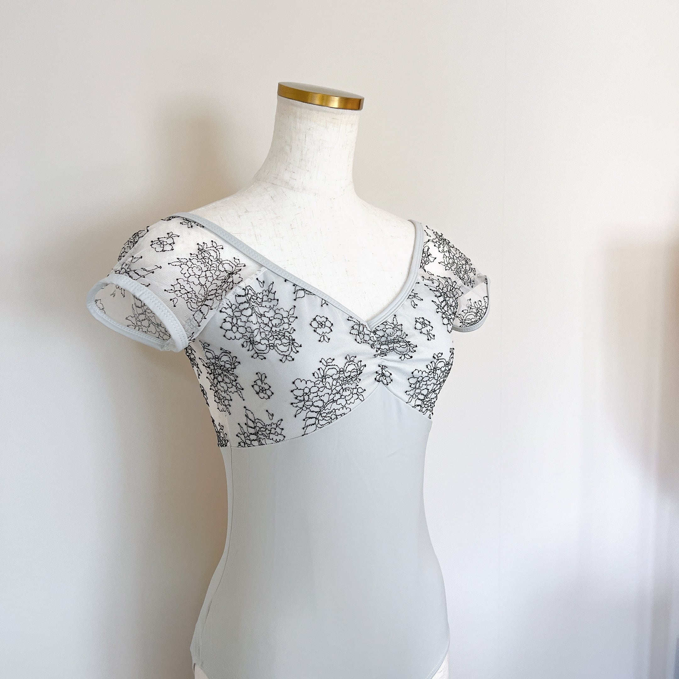 ピンチフロント 刺繍 ハーフスリーブ バレエレオタード(ブルーグレー)
