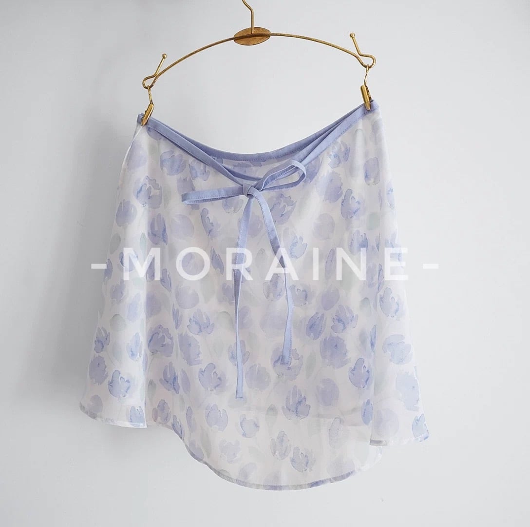 淡いブルーのチューリップがそっと描かれた、透明感あふれるシフォン素材の巻きスカート。