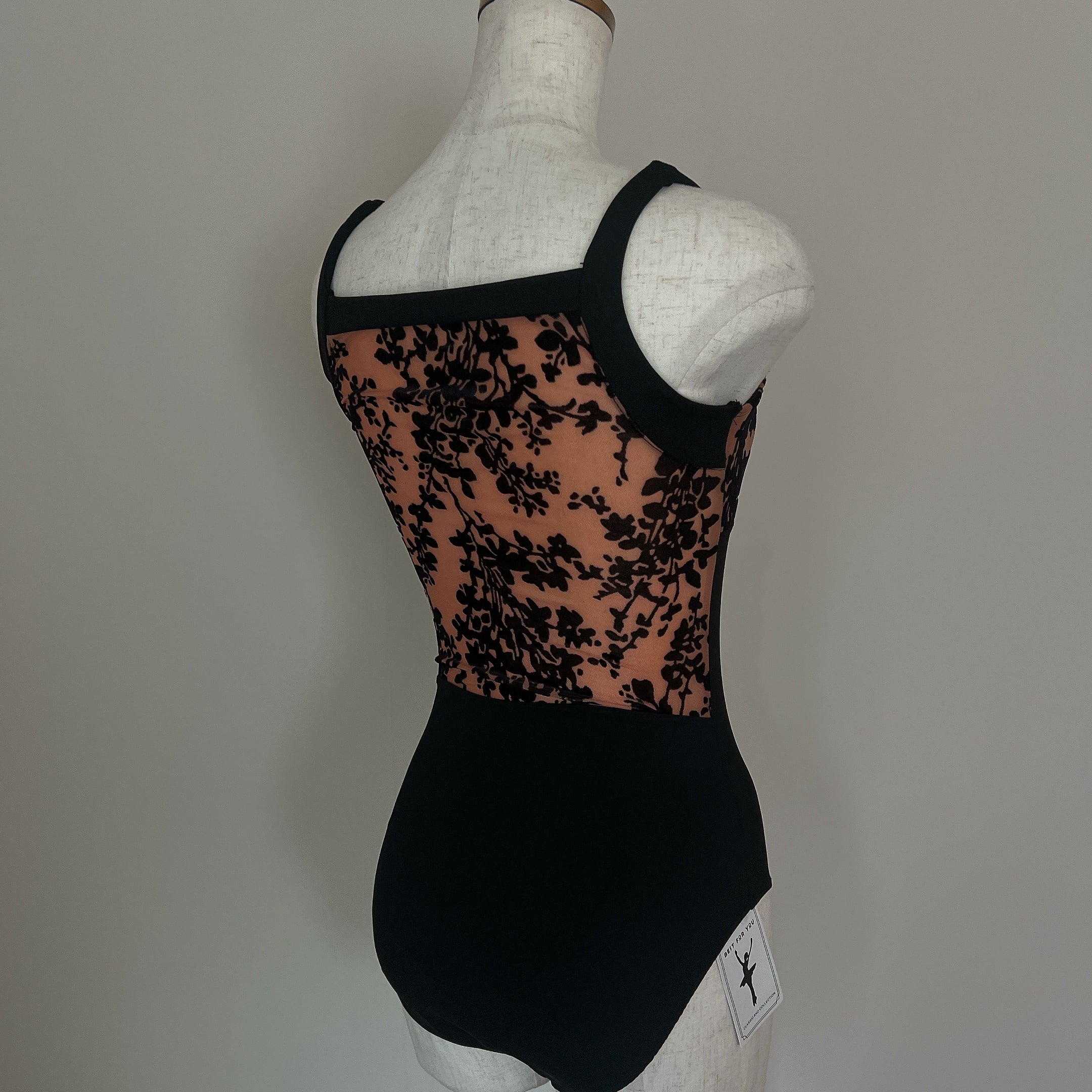 繊細なベロアフロッキー加工で描かれたフラワーモチーフが印象的なキャミソールレオタード。
