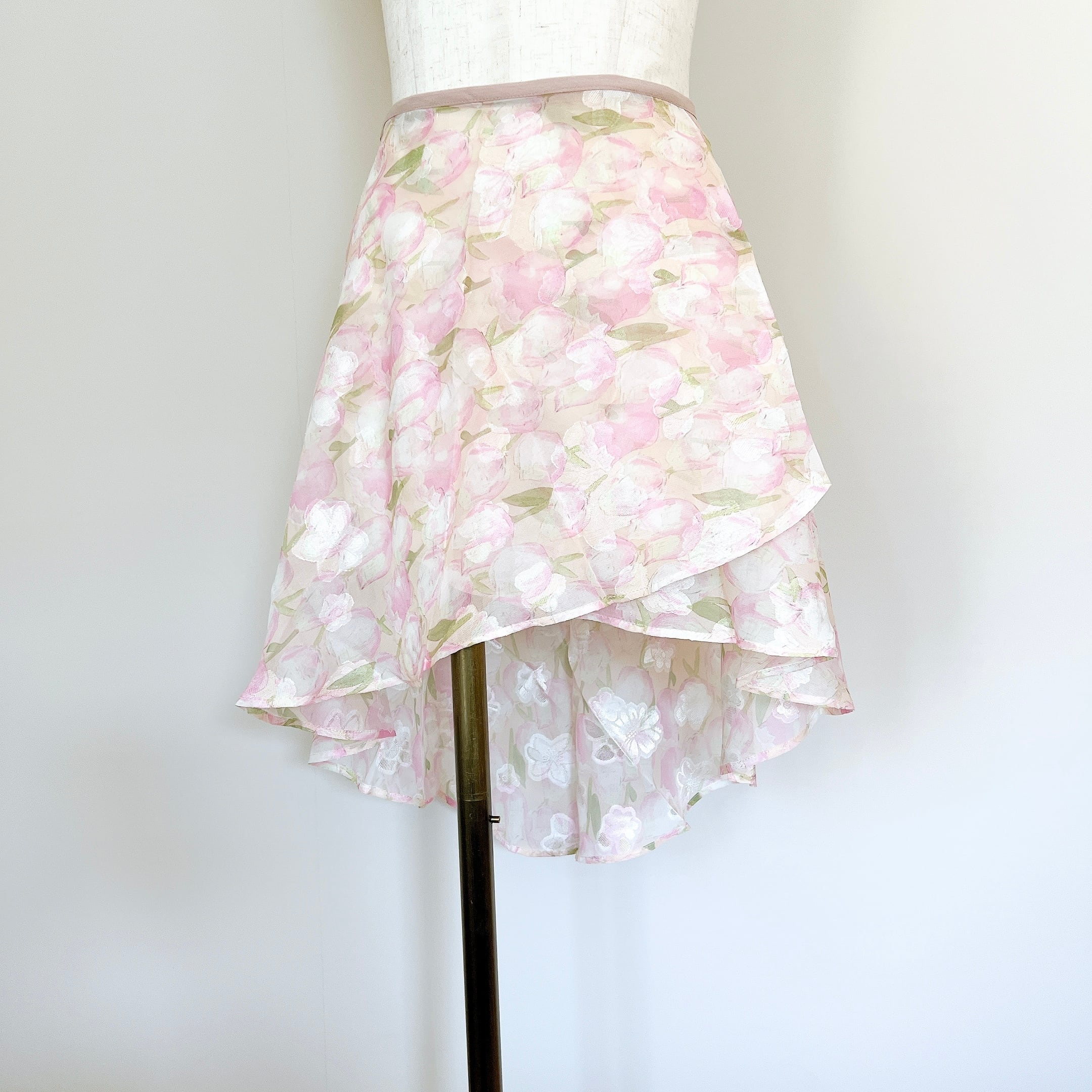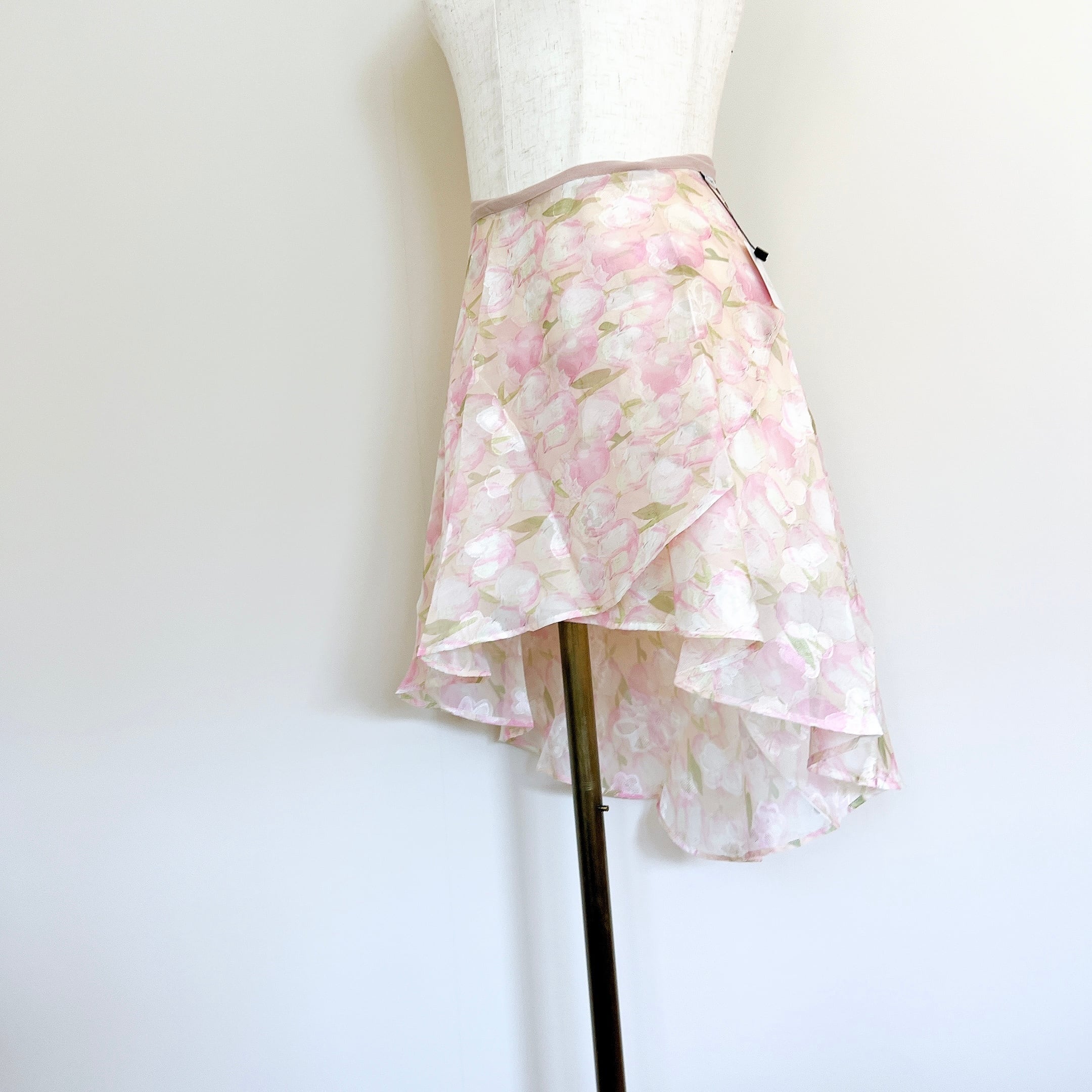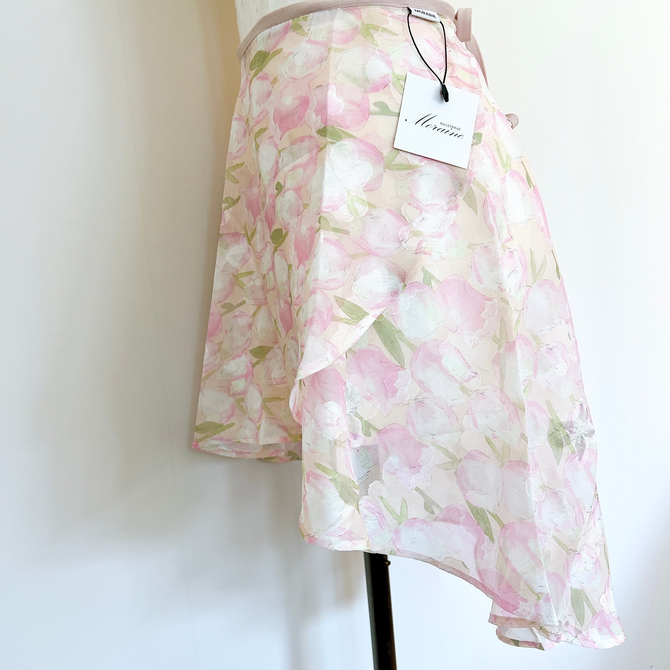 淡いのチューリップがそっと描かれた、透明感あふれるシフォン素材の巻きスカート。