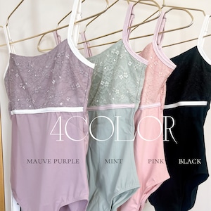 繊細なレースと美しいトリミングラインが目を引くキャミソールレオタード