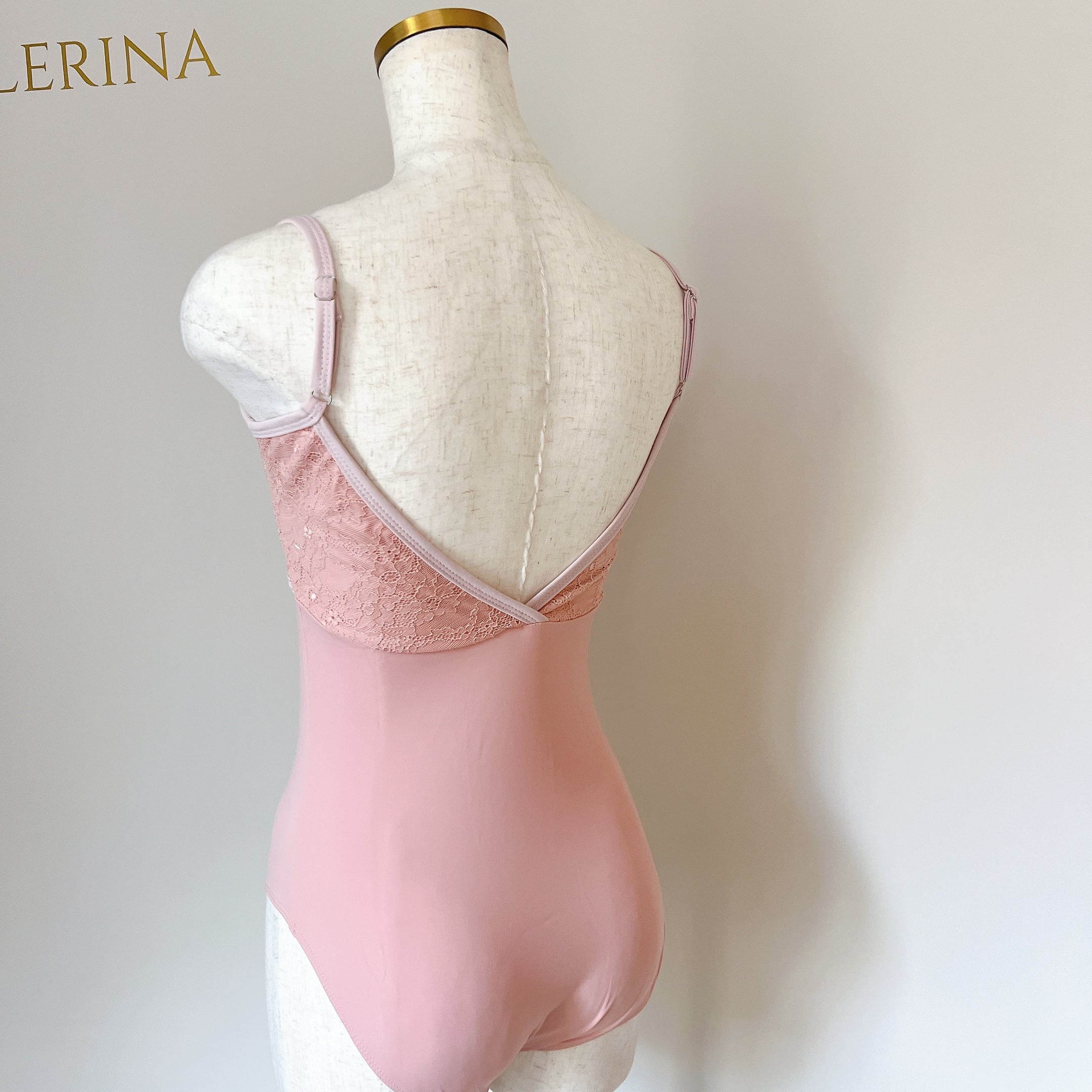 繊細なレースと美しいトリミングラインが目を引くキャミソールレオタード