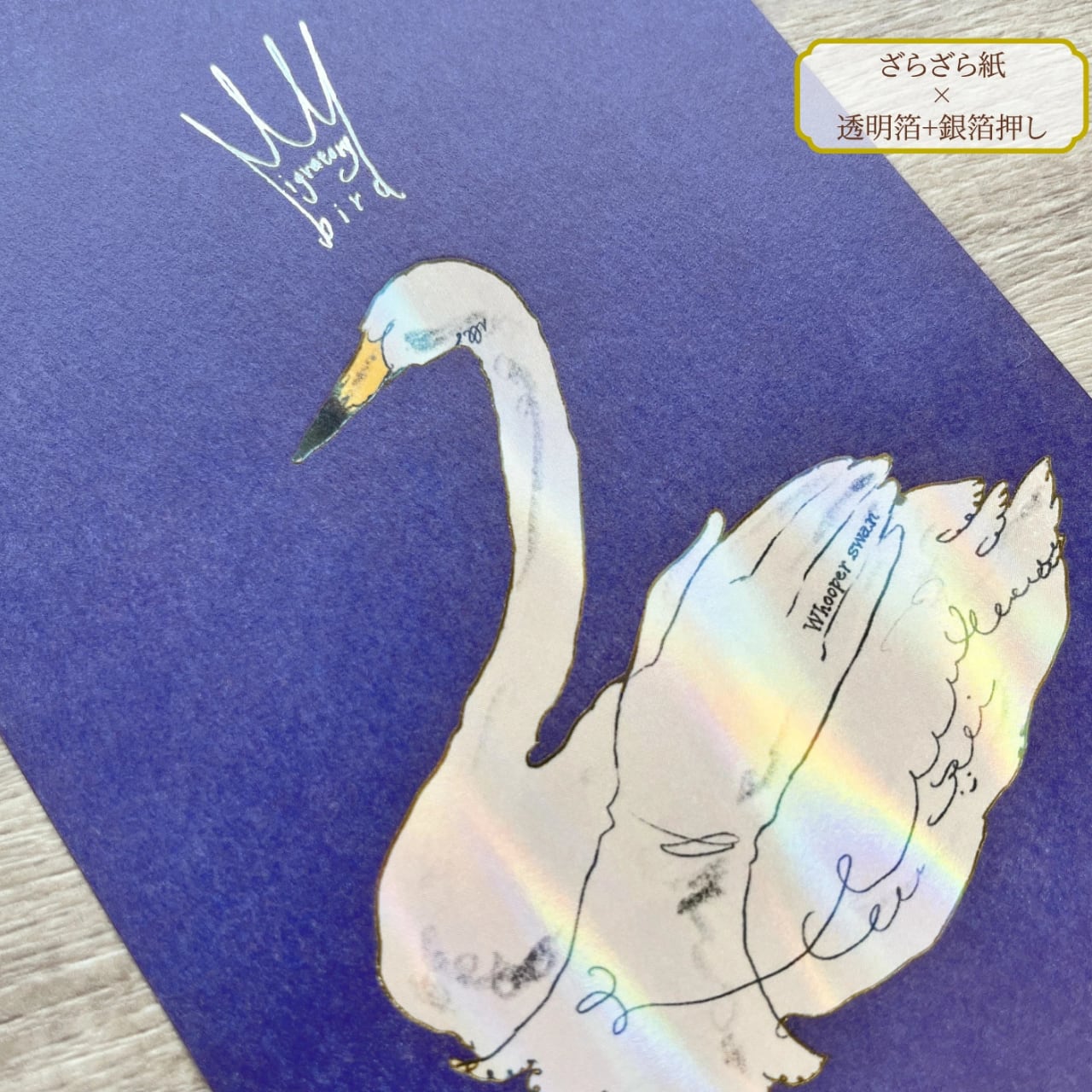 オーロラ色にスワンが煌めく箔と、王冠のシルバー箔の2種類が使用されています。