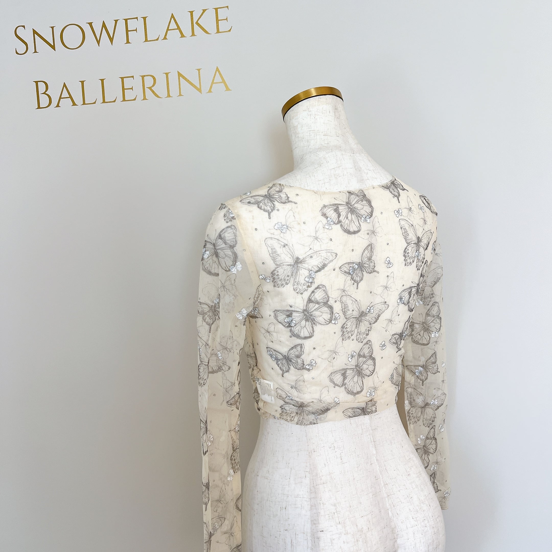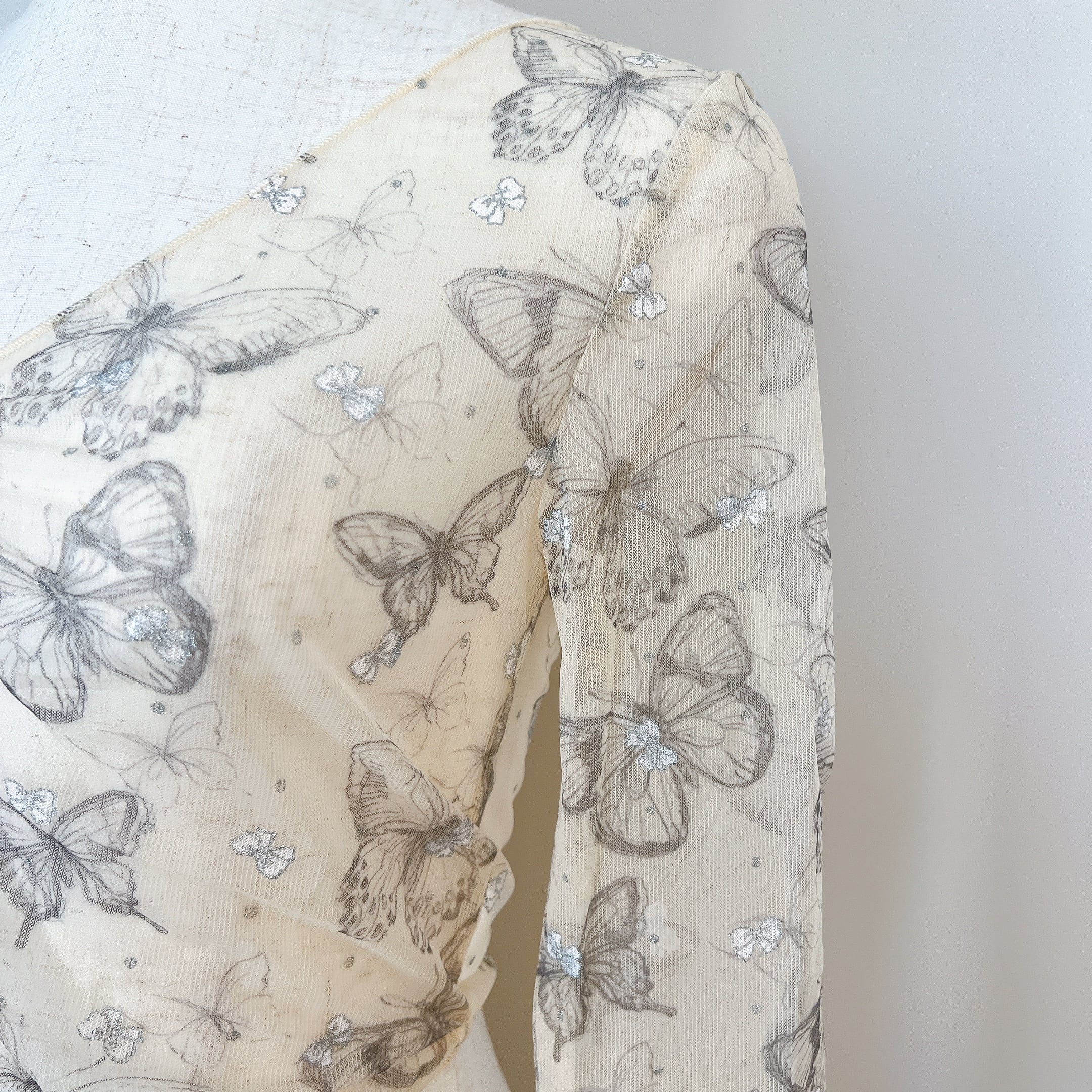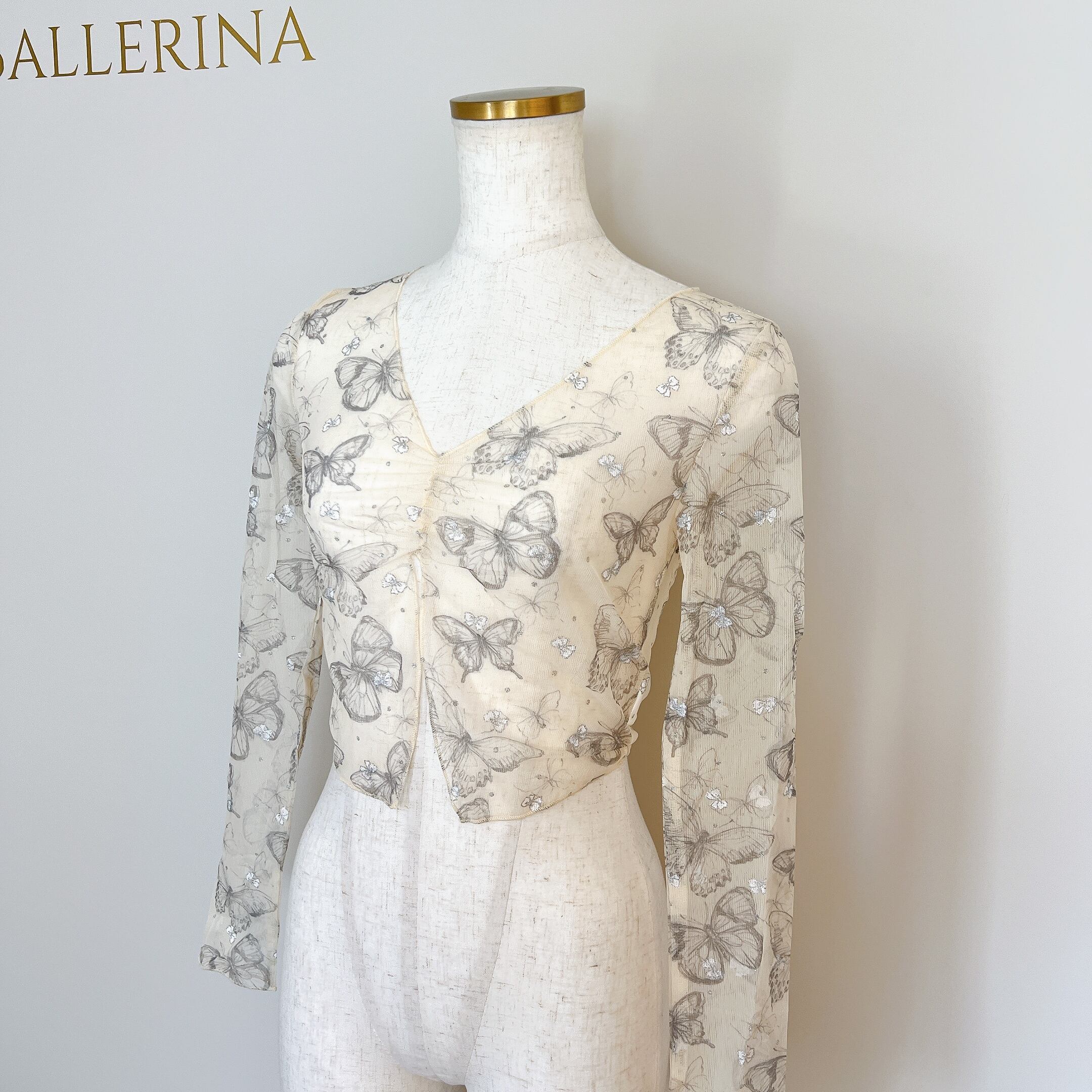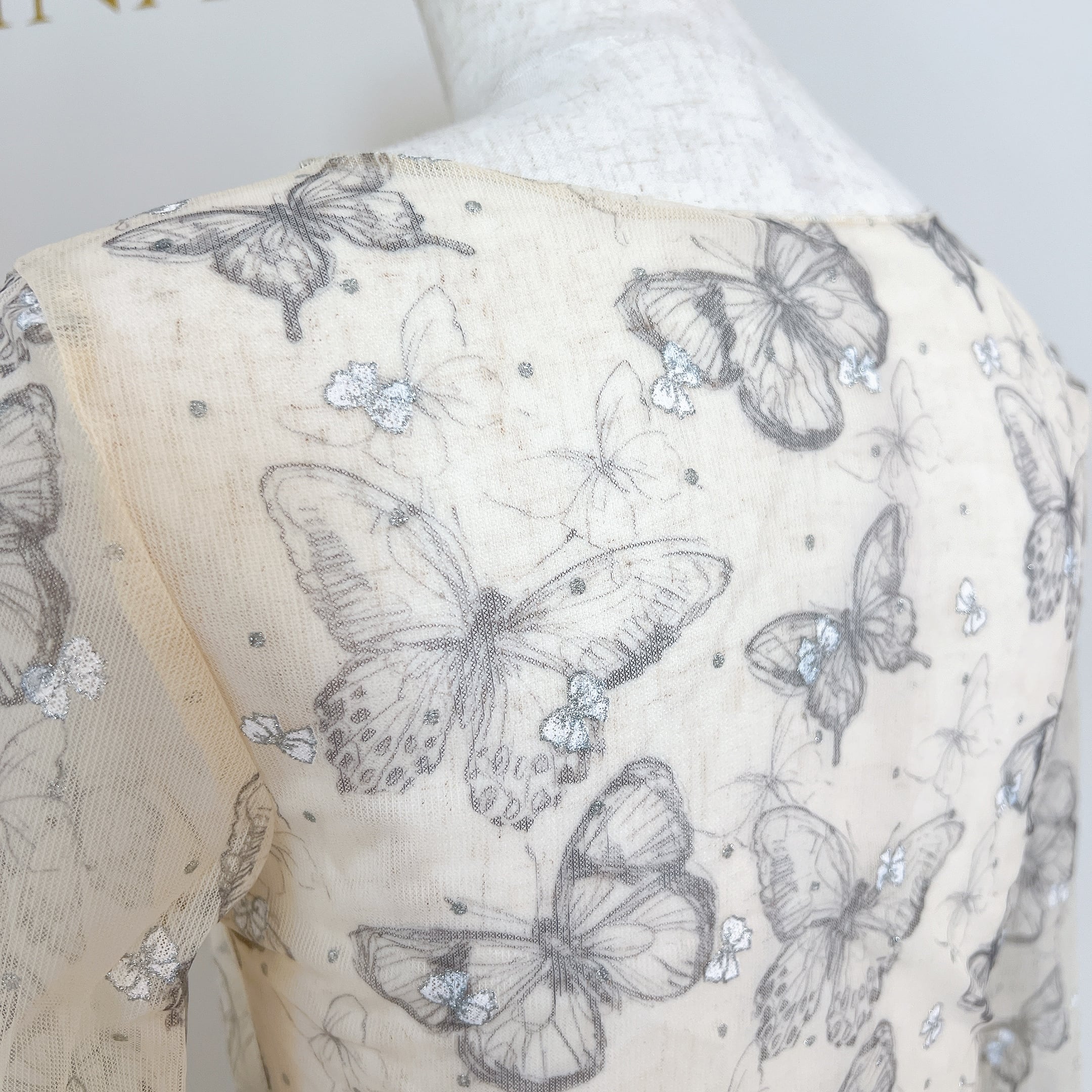 軽やかなメッシュ素材に、繊細な蝶々柄をあしらった長袖トップス。