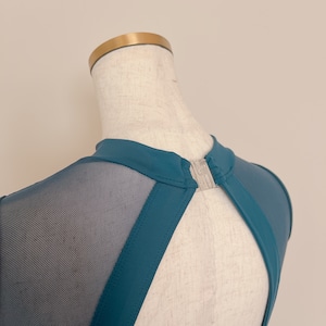 透け感のある上品なメッシュと、すっきりとしたモックネックデザインが印象的なレオタード。