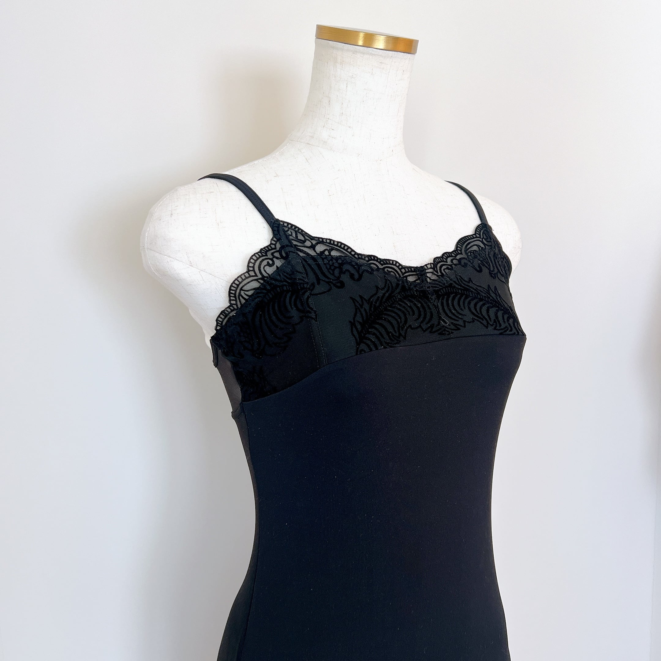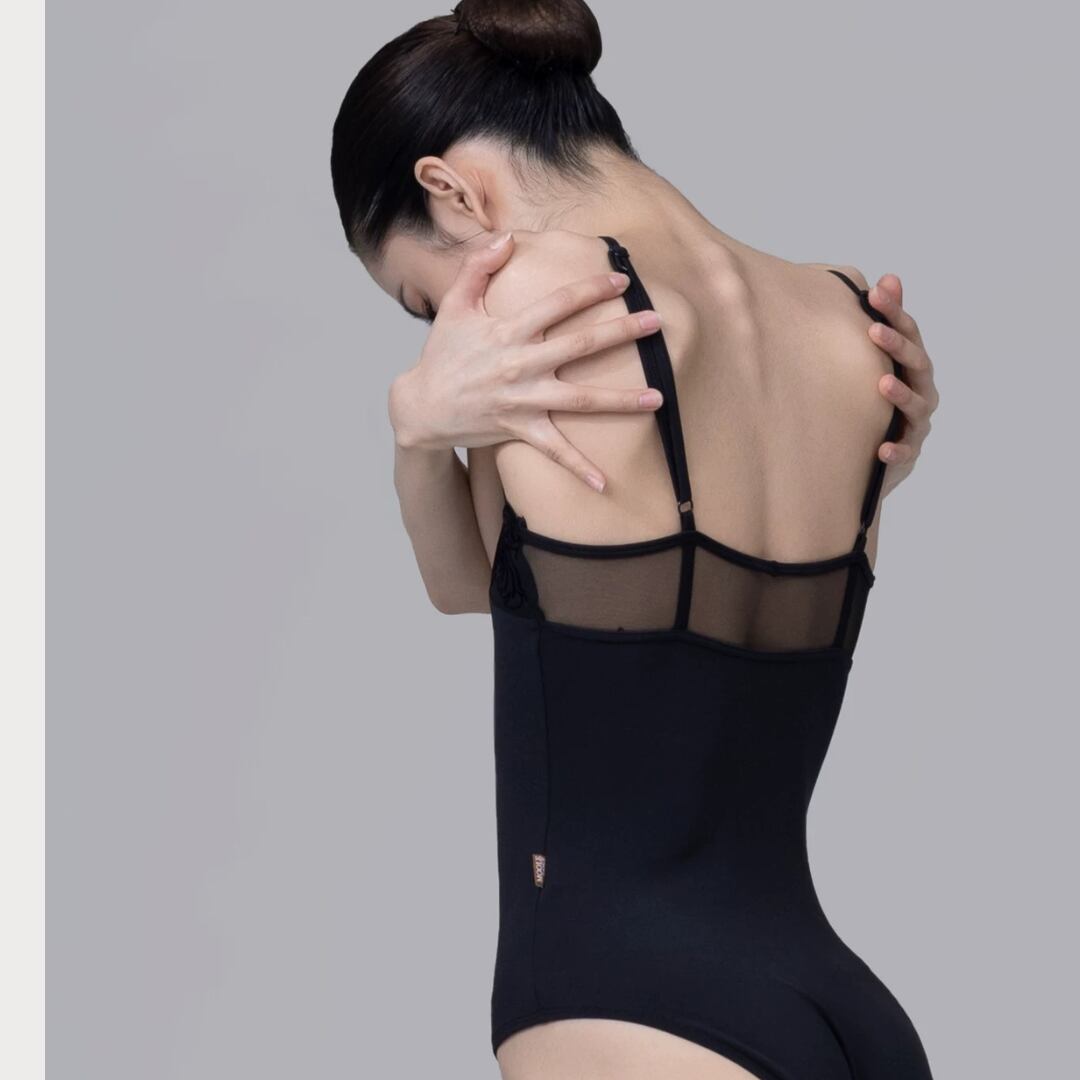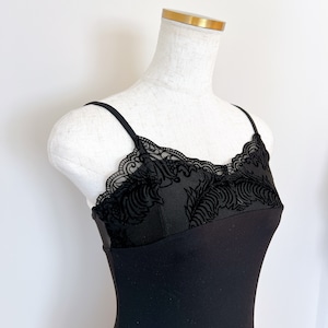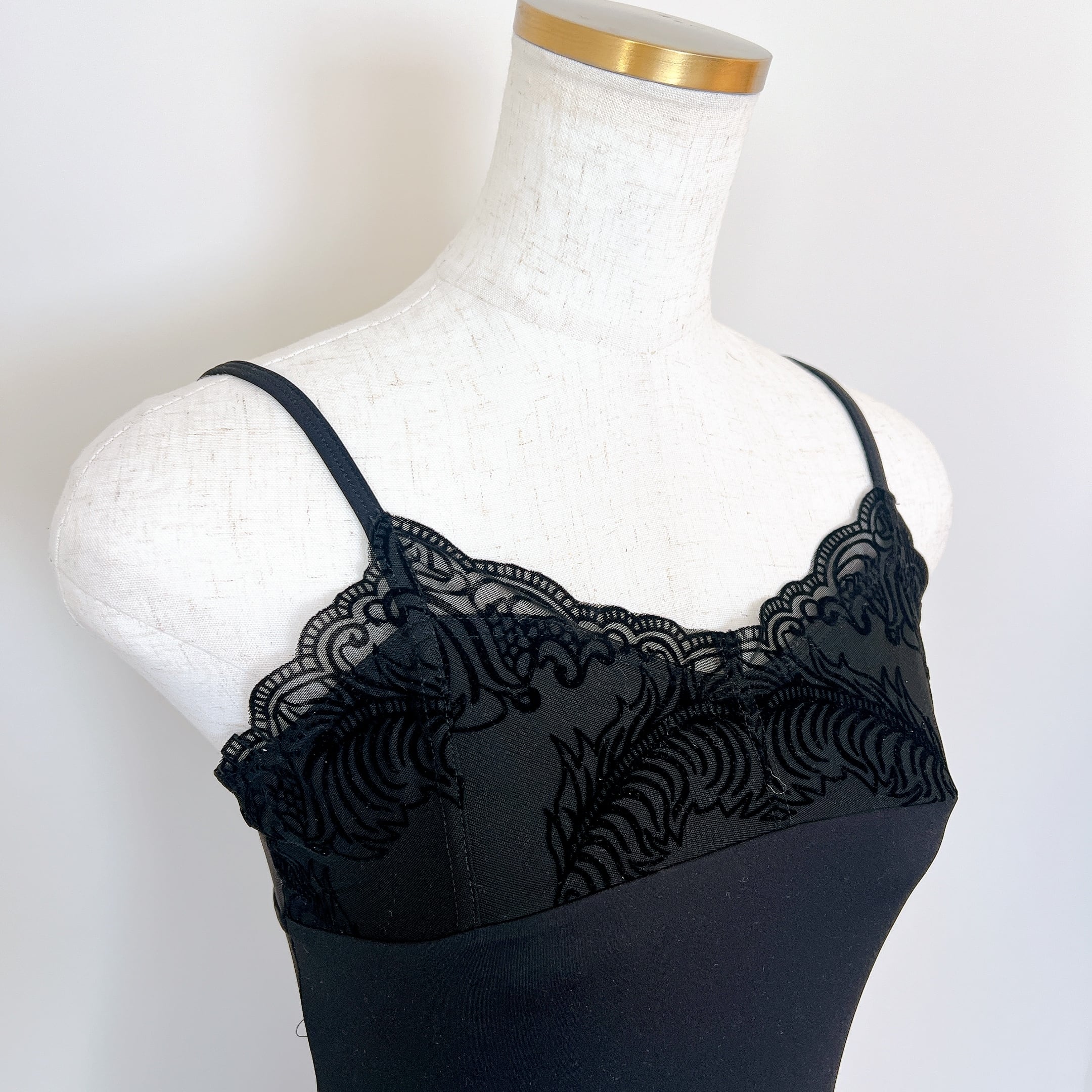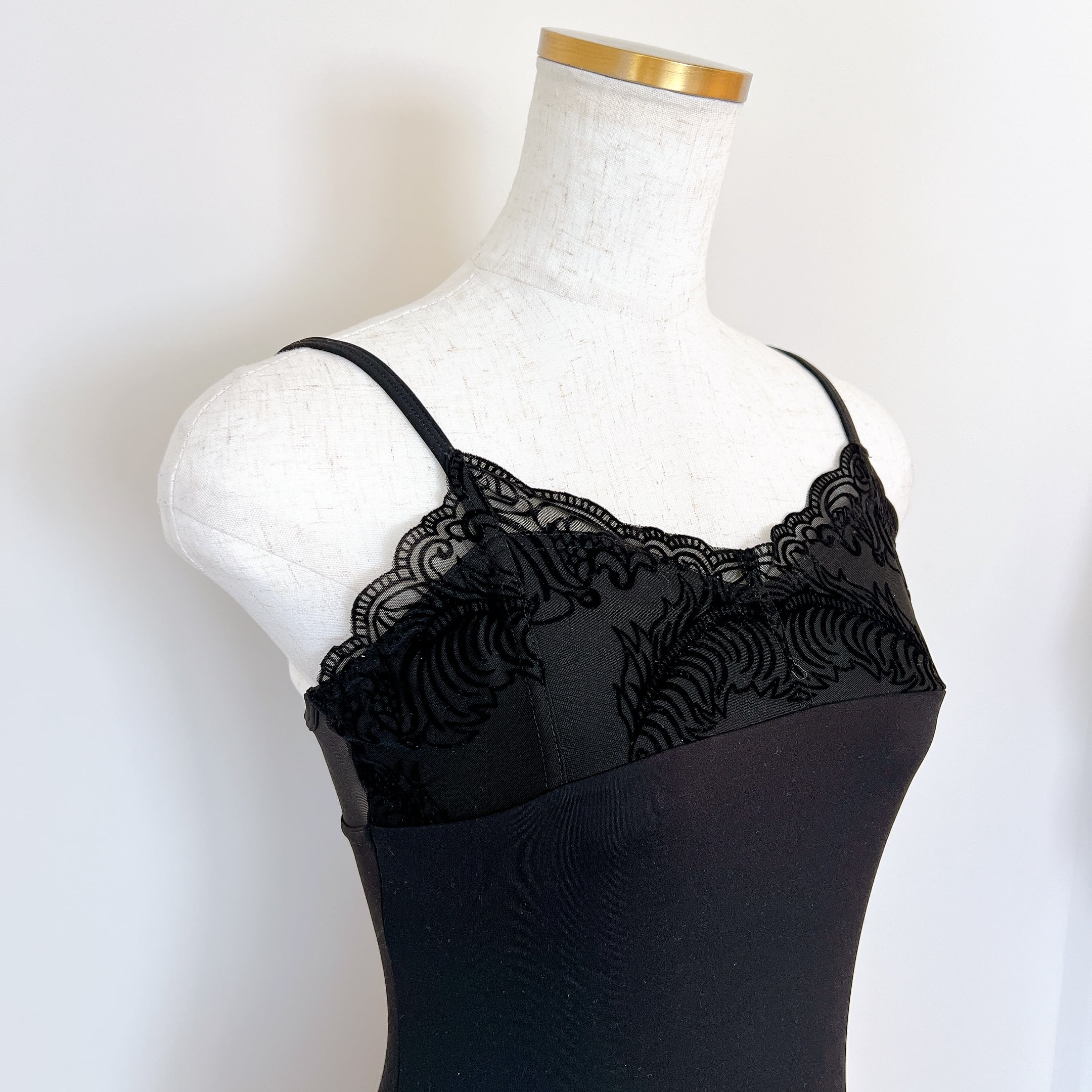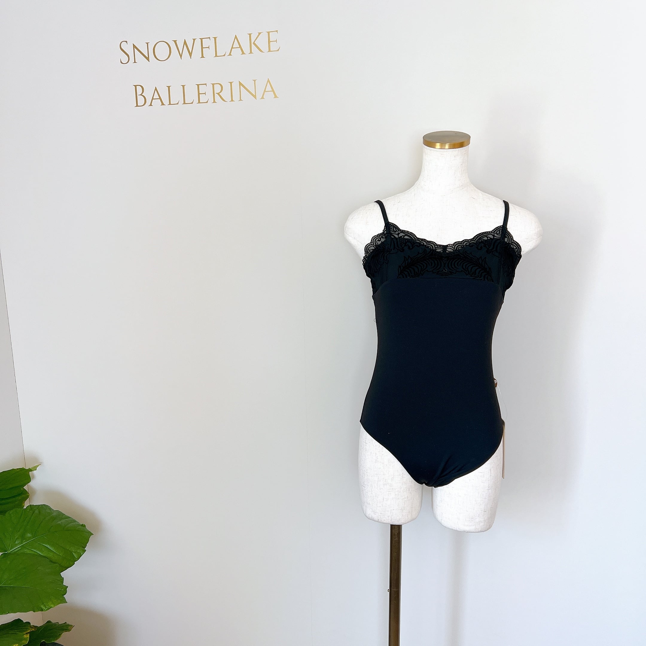 胸元にあしらわれた繊細なベルベット調レースが、落ち着いた華やかさを添えるレオタード。
