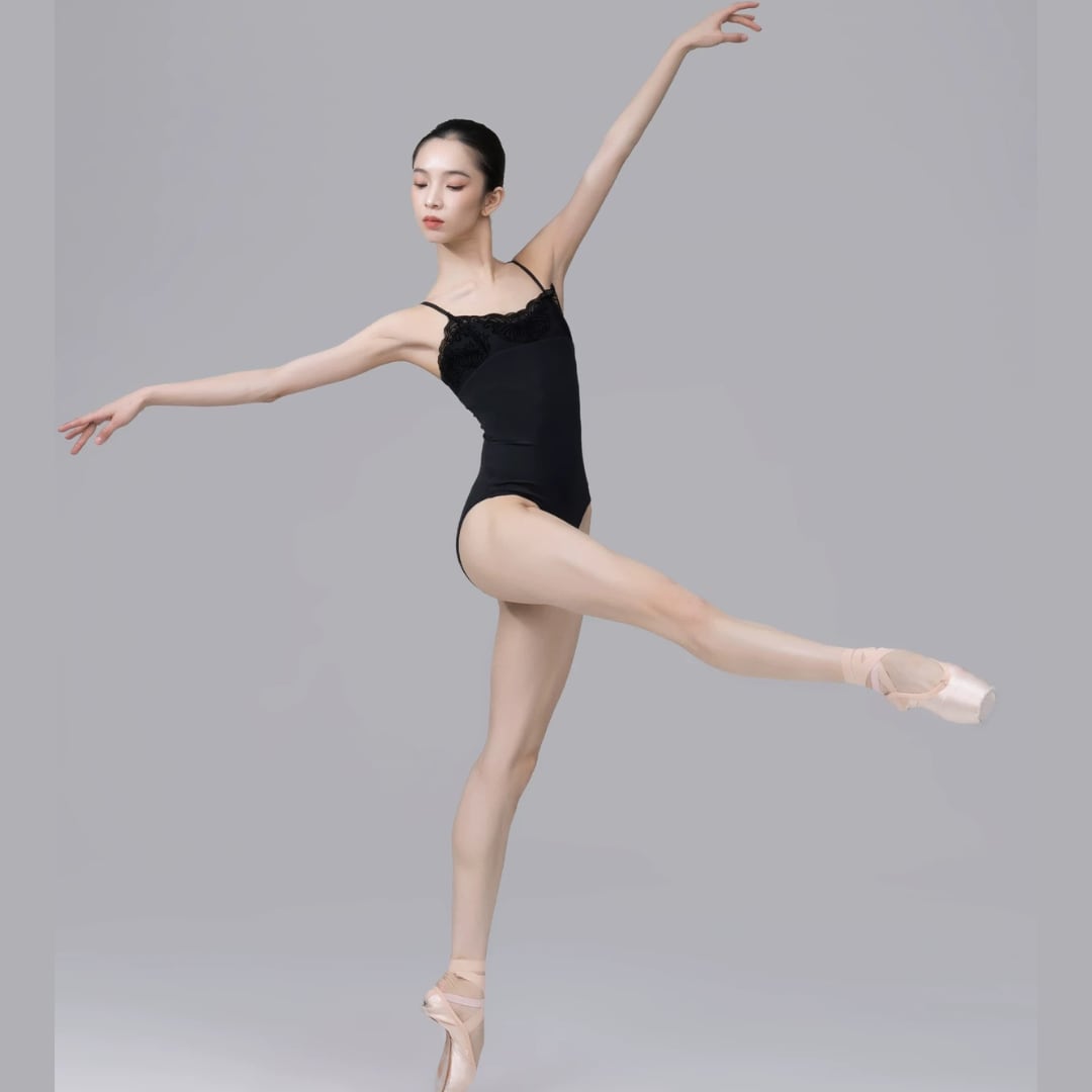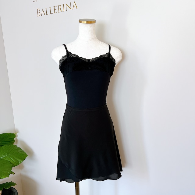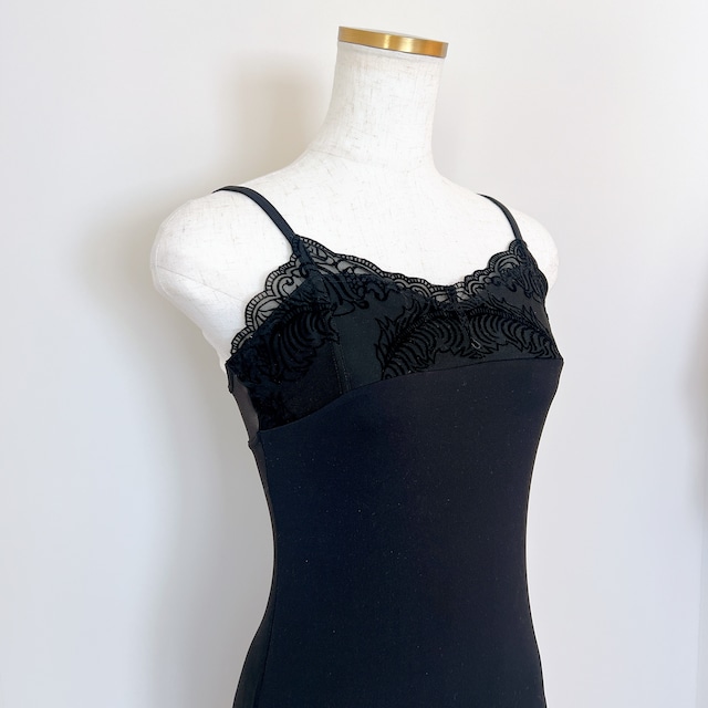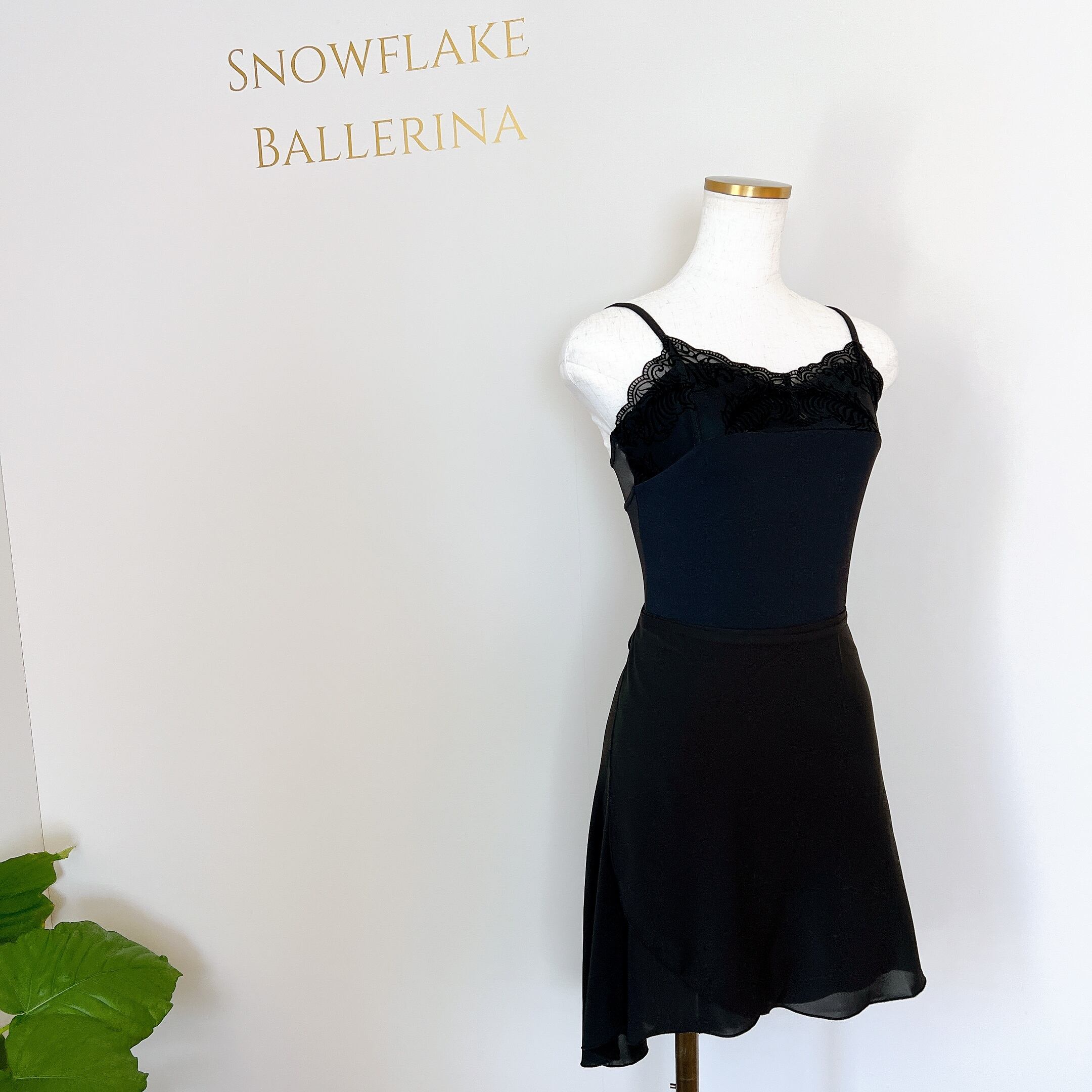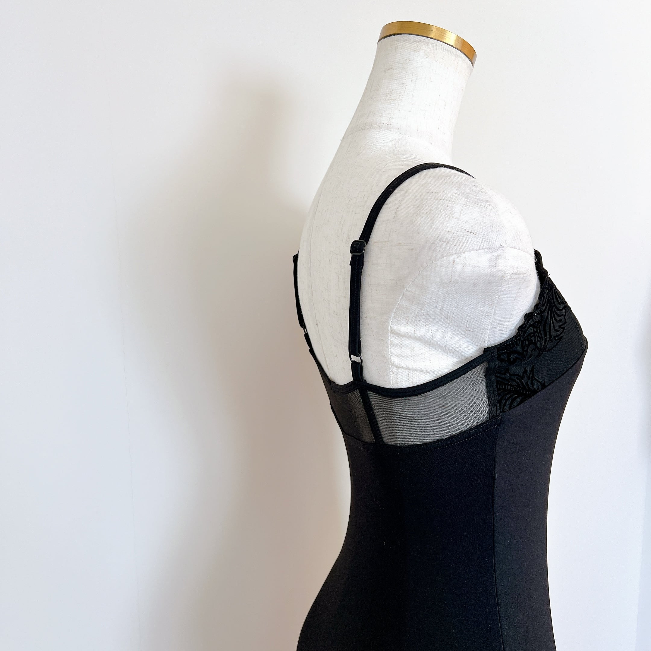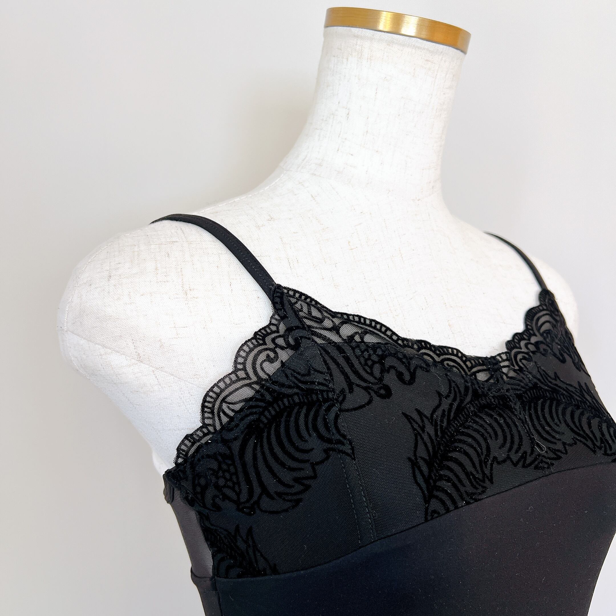 胸元にあしらわれた繊細なベルベット調レースが、落ち着いた華やかさを添えるレオタード。
