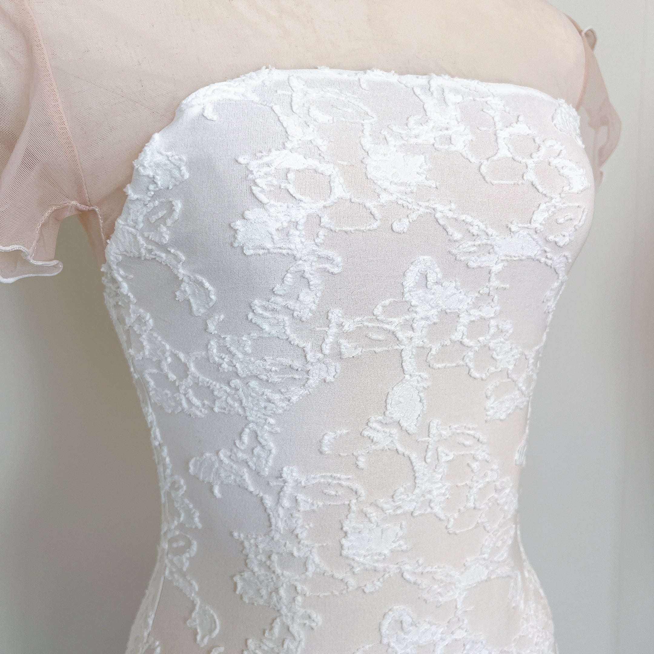 立体感のあるフローラルジャカード生地と、軽やかなフリルスリーブが印象的な