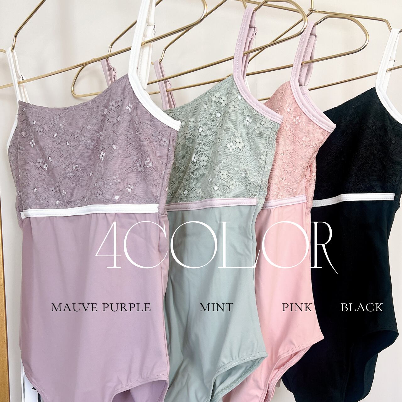 上半身にあしらわれたレースは柔らかく肌なじみが良く、控えめな透け感が上品さを演出します。ウエスト部分にはダスティピンクのトリミングが入り、ボディラインをすっきり引き締めて見せてくれるデザインです。