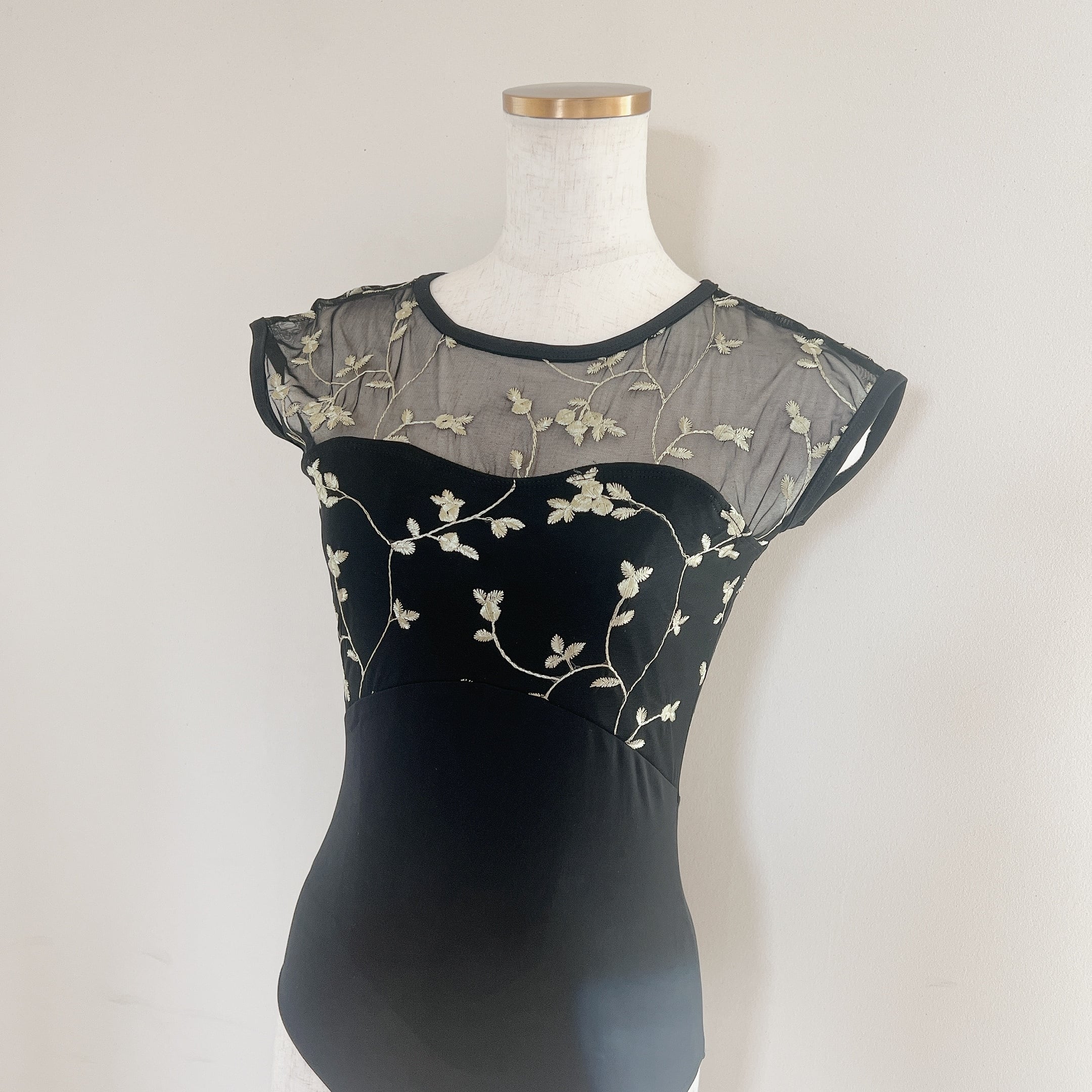 キャップスリーブ オープンバック 刺繍バレエレオタード(BLACK)