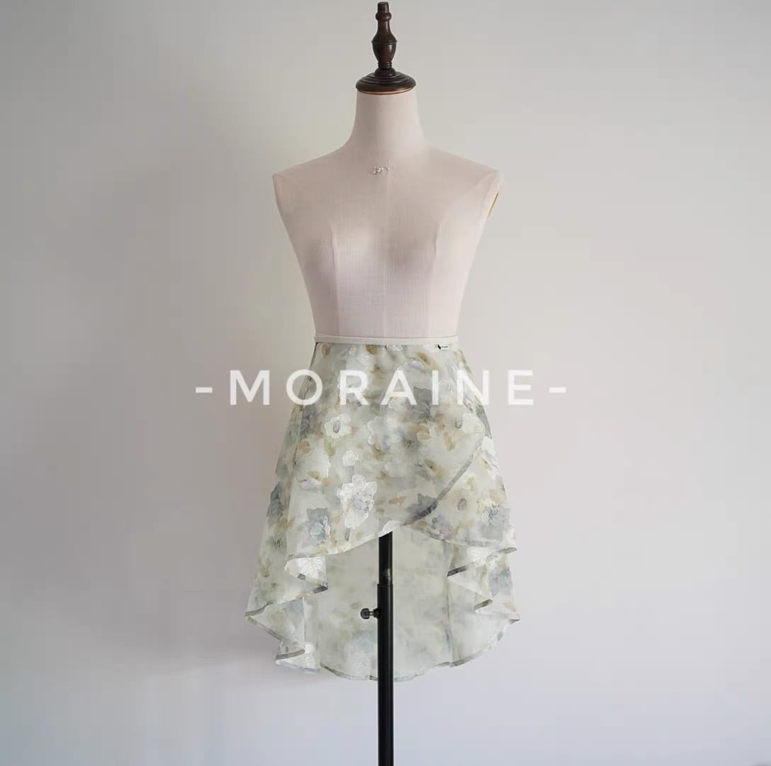 薄いグリーンのシフォン生地に淡いフラワープリントが美しいスカート。