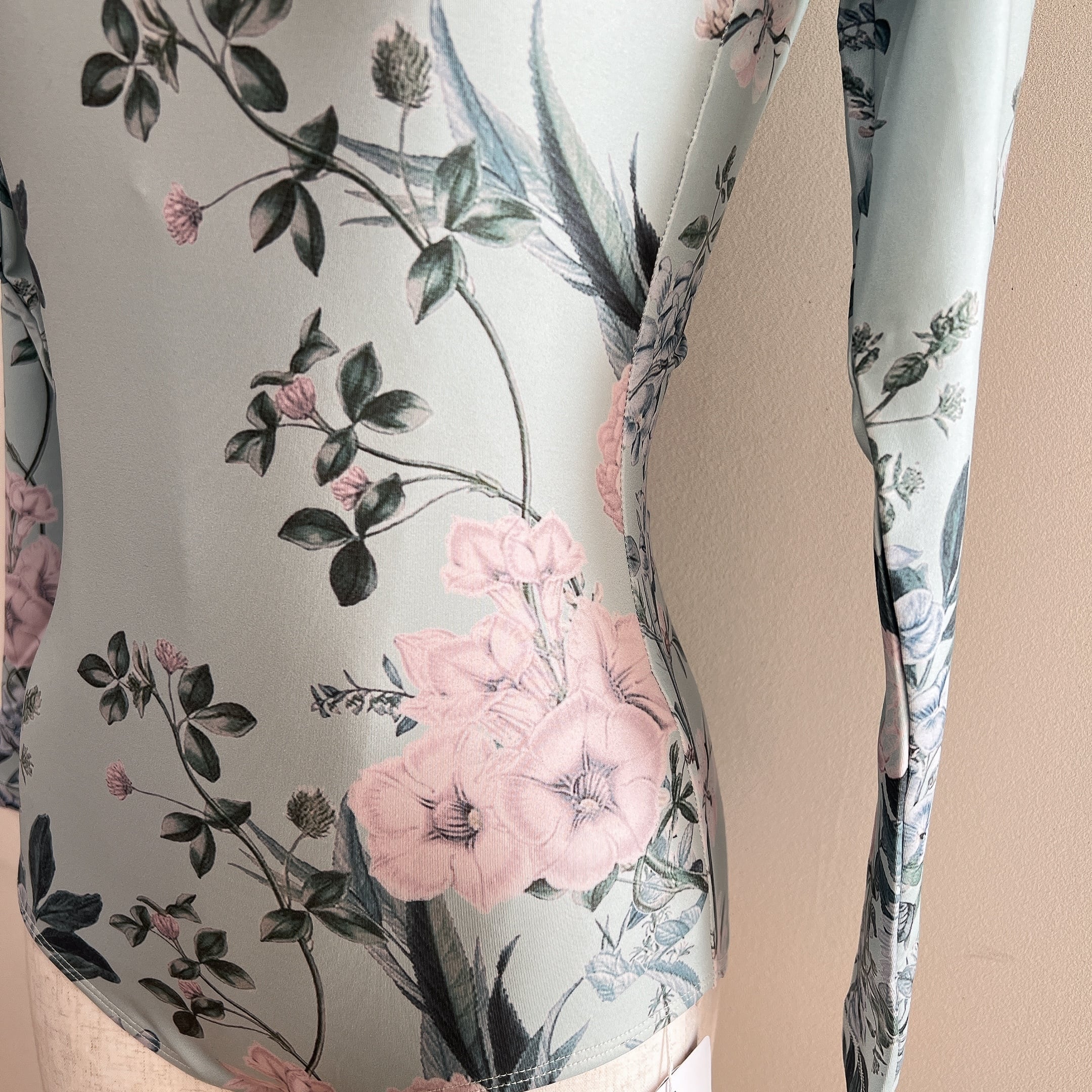 くすみグリーンにレオタード一面に広がるエレガントなフローラル柄が