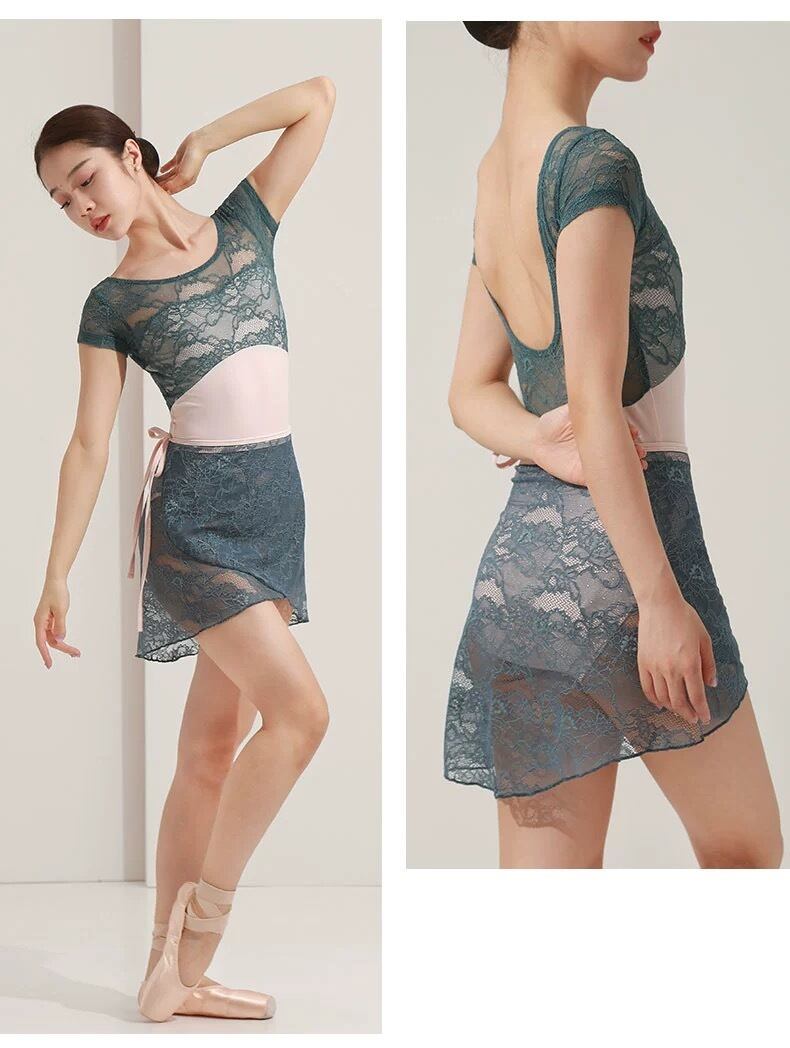 ブルーグリーンの繊細なレースとペールピンクの組み合わせがおしゃれなレオタード。
