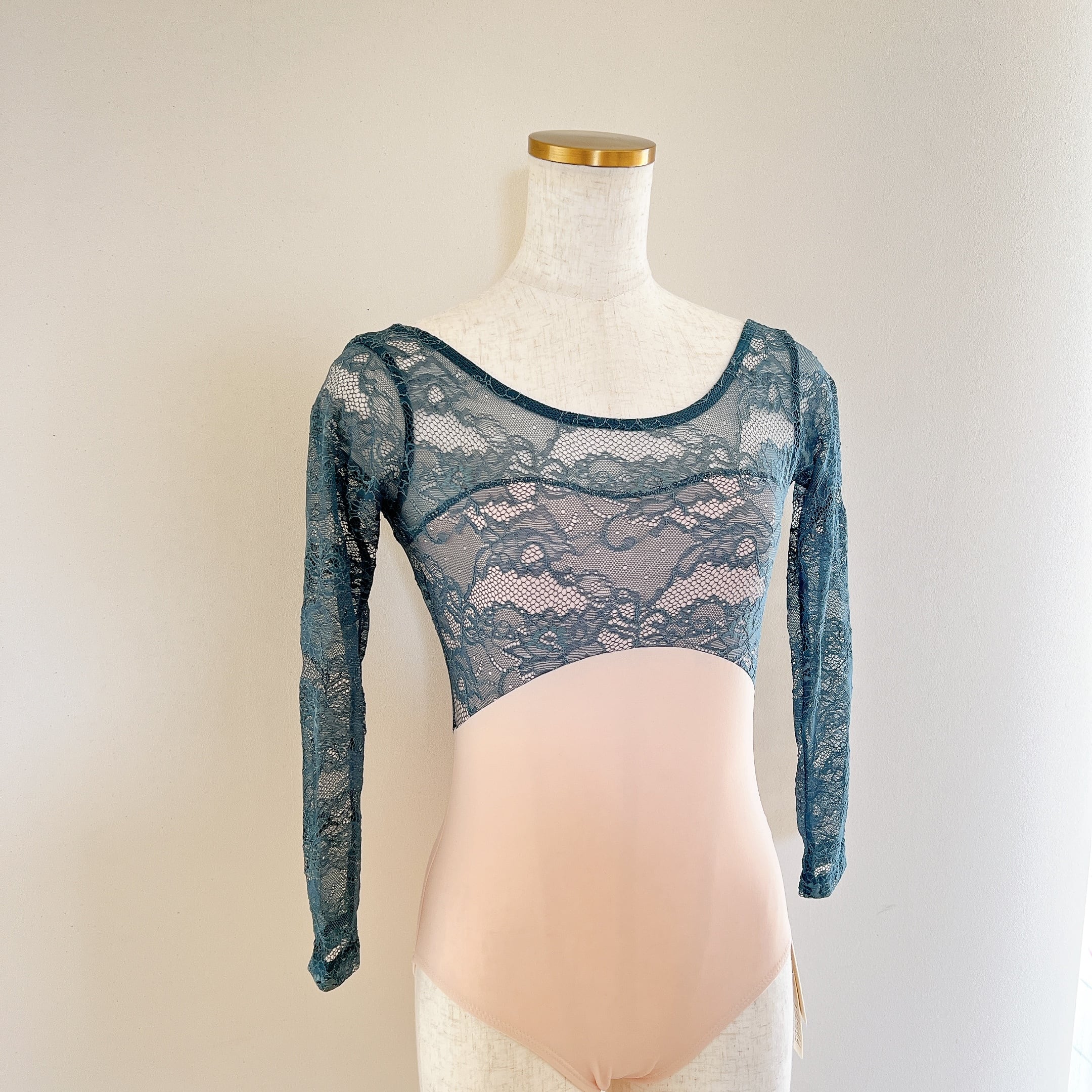 ブルーグリーンのレースとパウダーピンクのボディの組み合わせがおしゃれなレオタード。
