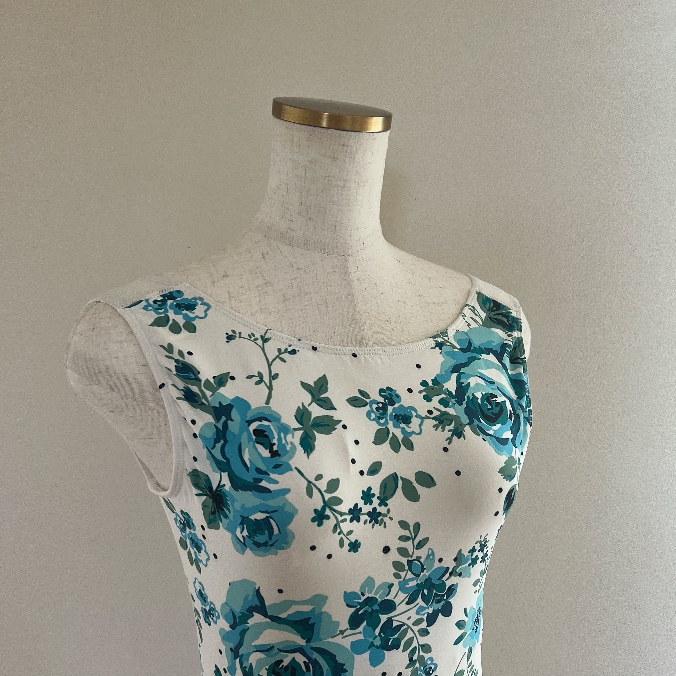 ホワイトの生地にブルーフラワーが爽やかなレオタード。