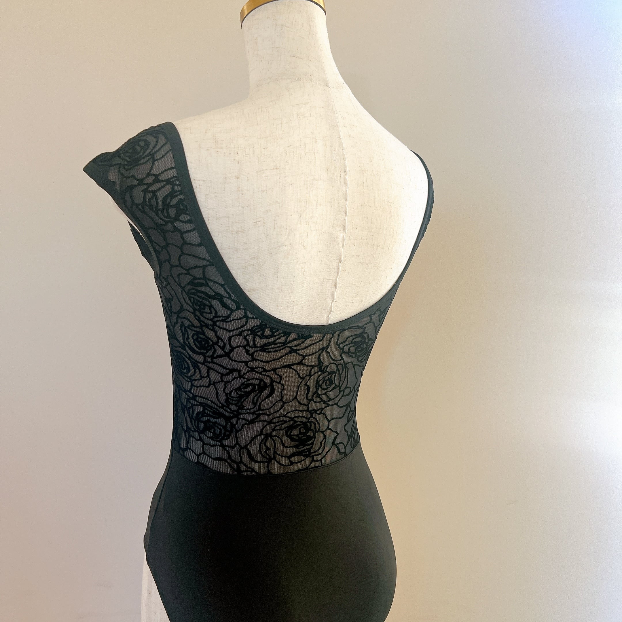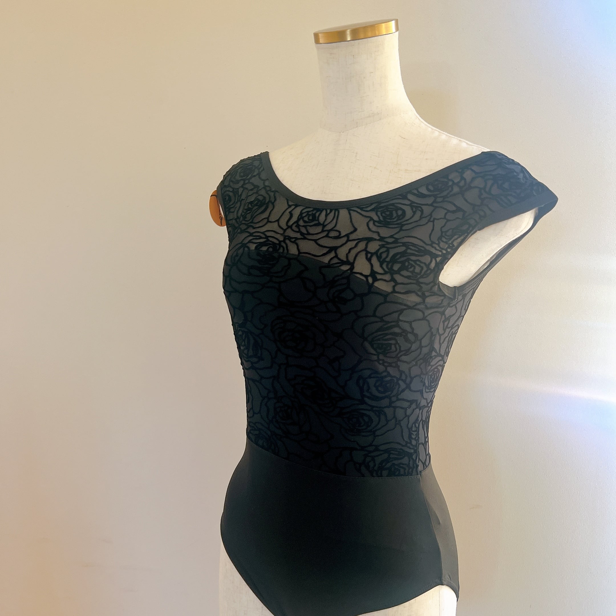 暗くなりがちなブラックなレオタードも、レースの透け感とフロッキー加工のローズ柄で