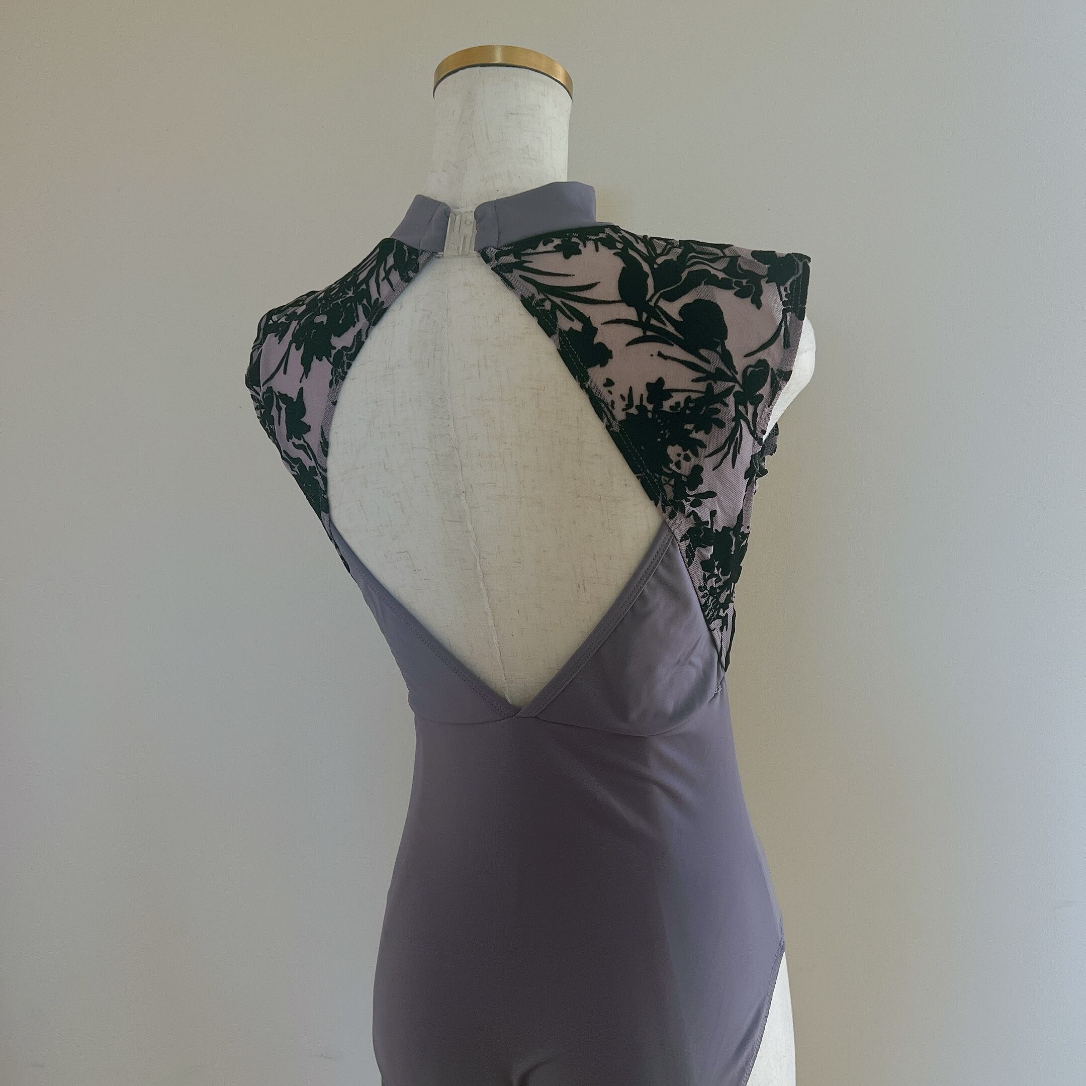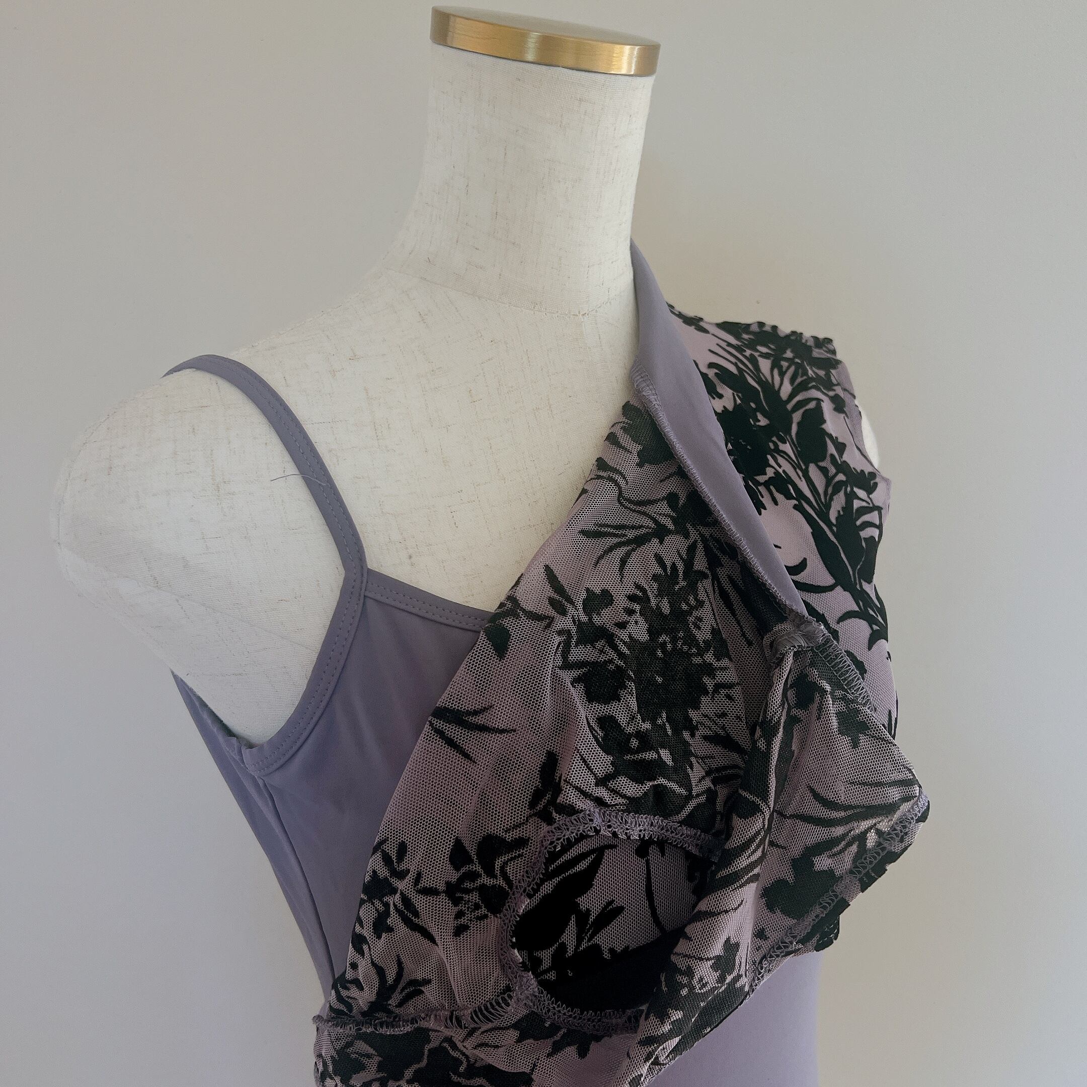 落ち着きのあるパープルのキャミソール型レオタードに、ハイネックデザインのチュールが重なっている凝った作りの1着です。