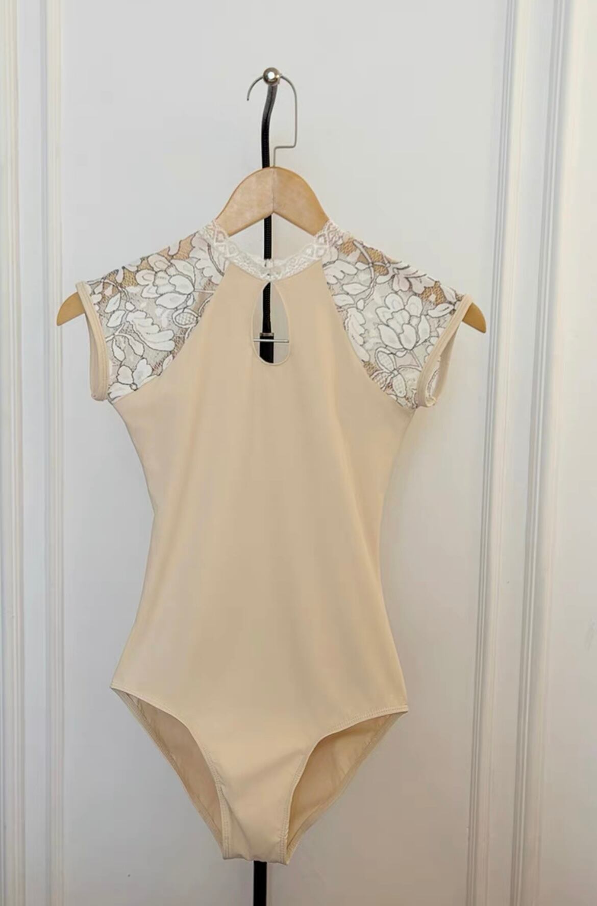 透かしレース キャップスリーブ バレエレオタード(アイボリー)