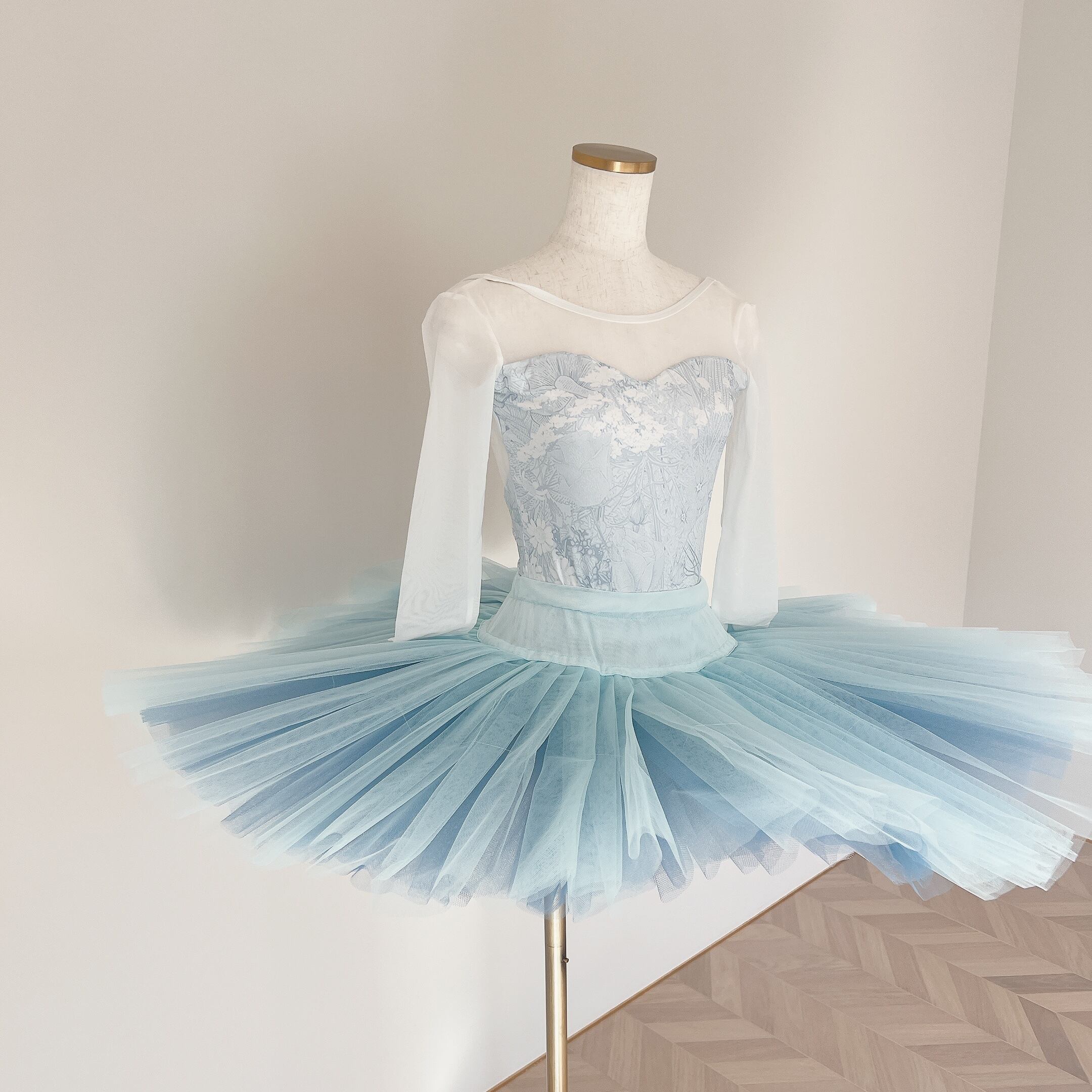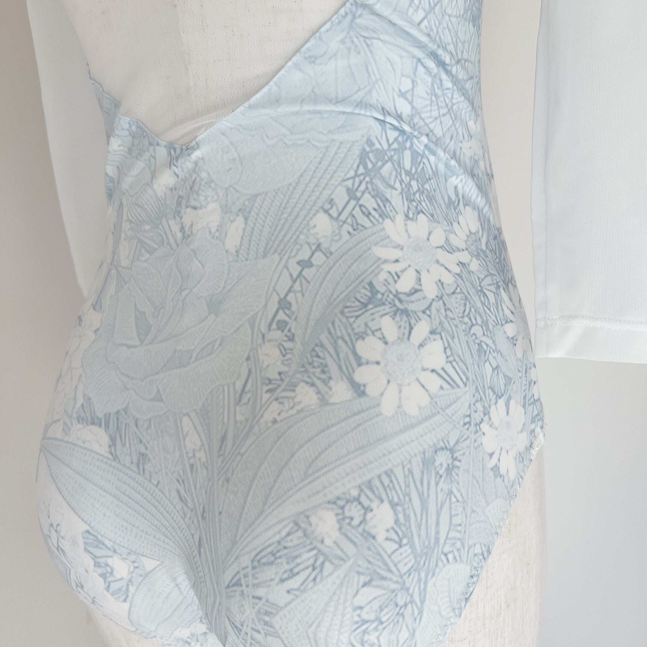 アイスブルー フラワープリント ロングスリーブ バレエレオタード