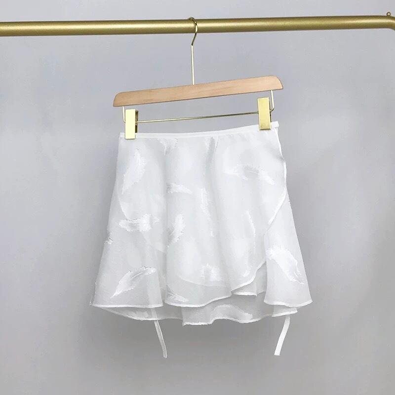 純白なホワイトに白鳥の羽を思わせるフェザーのデザインが美しいスカート。