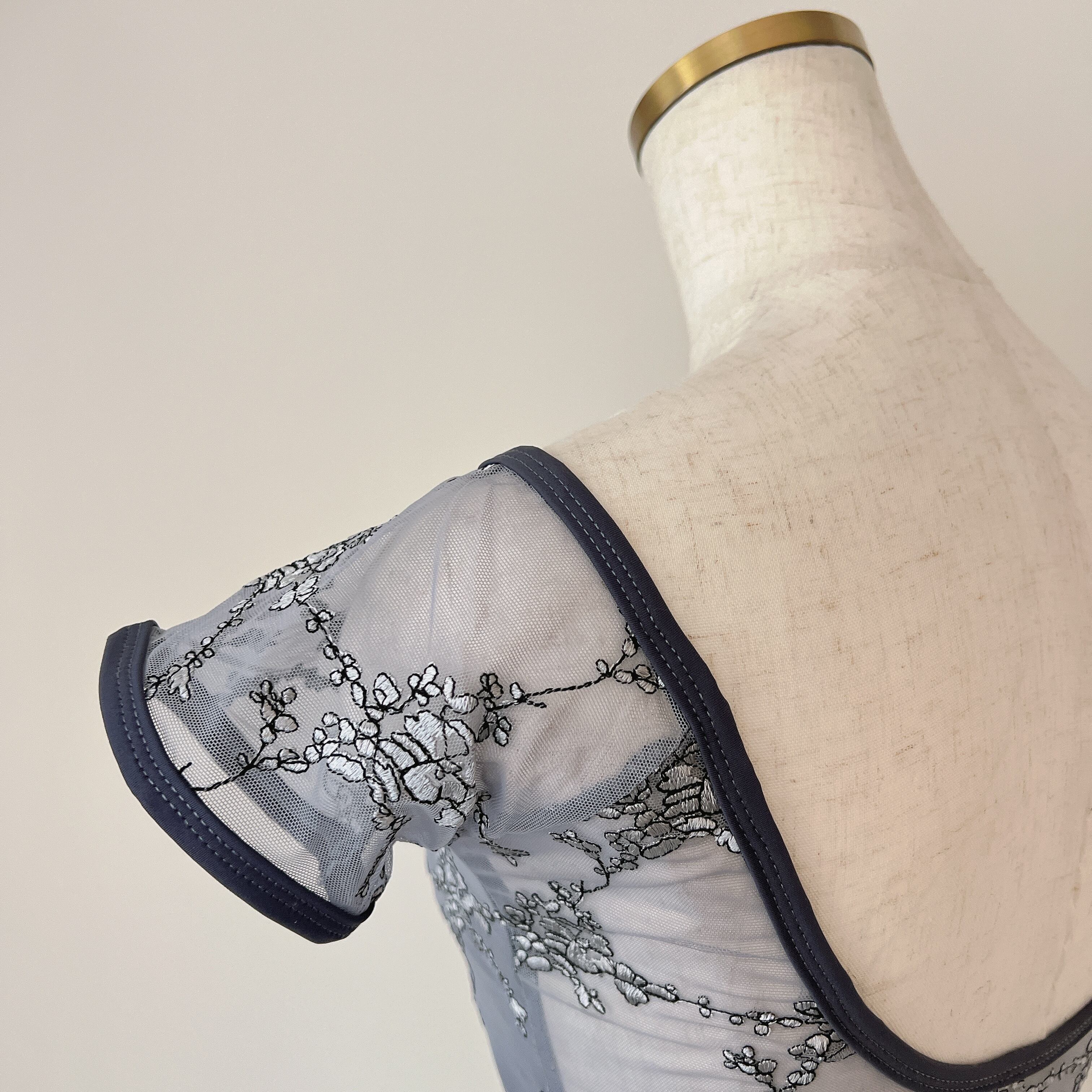 ピンチフロントされた胸元、刺繍入りのチュールがデザインのポイントです。
