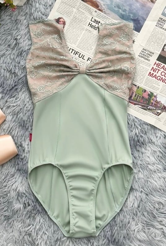 ペールグリーン×シャンパンピンクの組み合わせがとってもおしゃれなレオタードです。